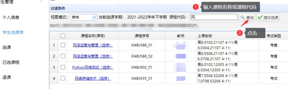 1、选课系统开放时,学生登录教务系统,点击选课,点击查询,课程列表会出现本学期所开设的可选课程列表,从中找到相应的课程序号,进行勾选后,再点提交选课。
