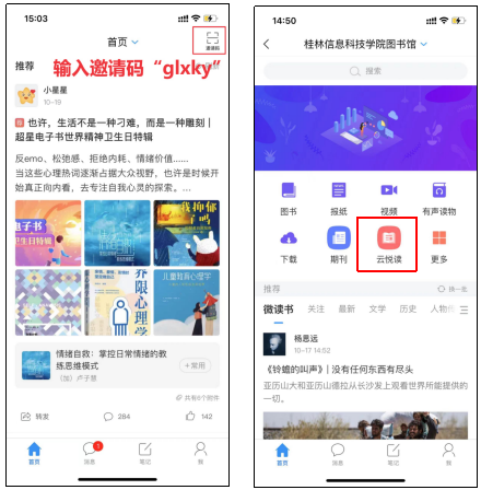 3.登录后在首页右上角输入邀请码glxky,即可进入beat365中文官方网站首页,首页点击“云悦读”模块即可进入参与图书阅读活动;