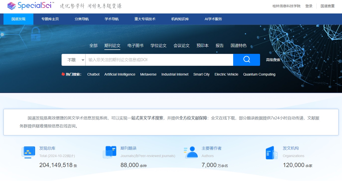 SpecialSci平台提供多种导航方式,如“学术(术语)导航”“分类导航”“机构导航”“重大专项技术导航”等;同时提供四种检索方式,即“快速搜索”“高级搜索”“专业搜索”“二次搜索”,读者可以根据自己需要,选择使用,达到查全和查准的平衡。本平台还提供多种增值及助读功能,如国道发现(文献总量达1.9亿条,包含8.8万余种期刊题录,提供动态目录、检索结果可视化呈现及全文传递服务),国道查重,机构知识库,检索结果统计功能,在线翻译助读功能,全文智能传递服务(7*24小时),AI学术服务等。SpecialSci平台适于科研工作者、高校教师、学科馆员、查新员、研究生及部分英文程度较高的本科生。