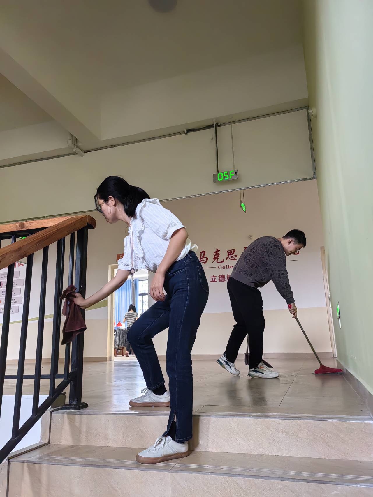 全体教师分工合作,密切配合,积极主动地参与到此次活动中来,齐心协力完成了办公室附近的两个楼道的清扫工作。在大家的努力下,办公楼卫生环境得到了进一步改善,整体面貌焕然一新。