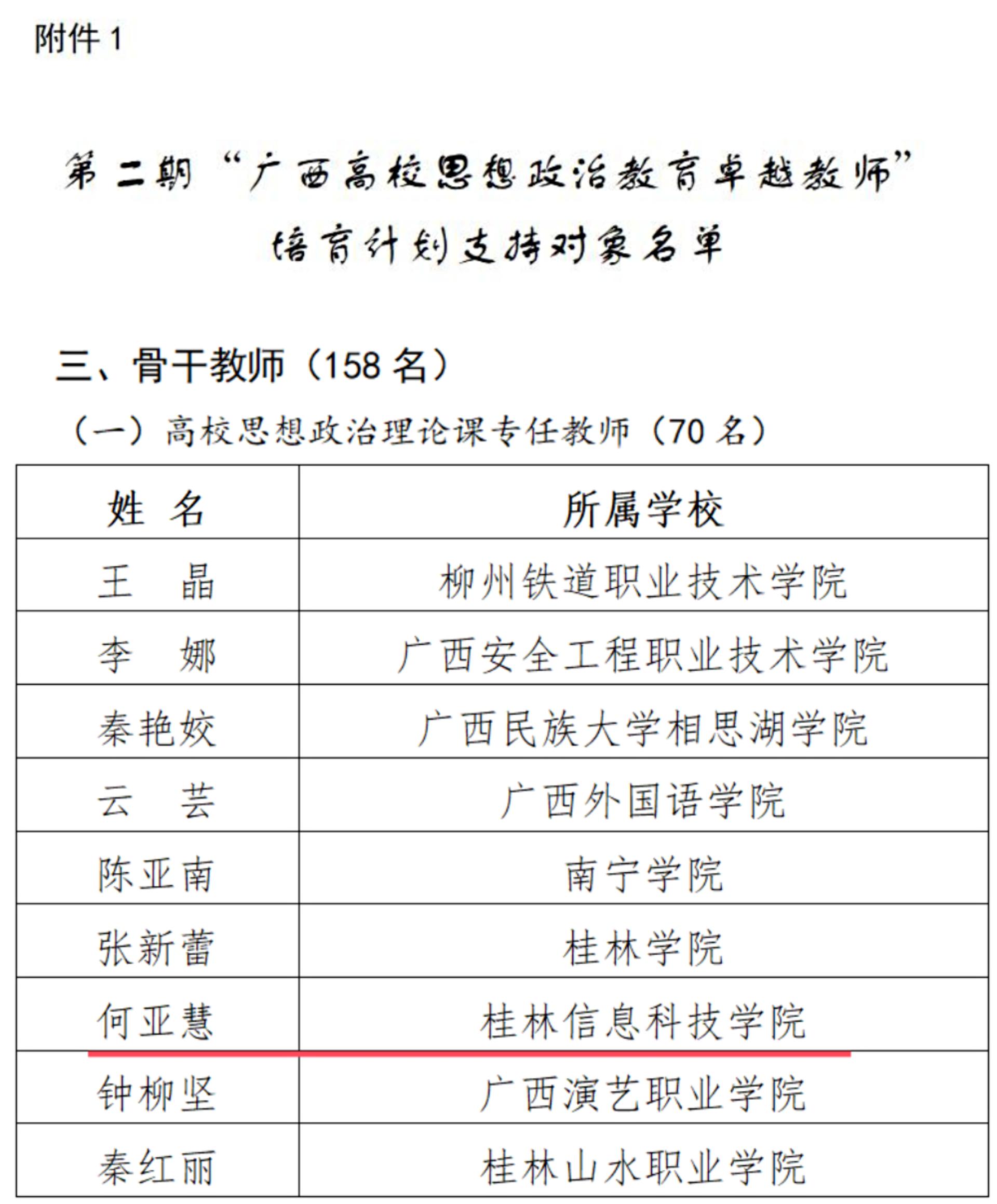 近日,自治区教育厅公布了第二期“广西高校思想政治教育卓越教师”培育计划支持对象“中青年骨干教师”名单,beat365官网马克思主义学院教师何亚慧成功入选。