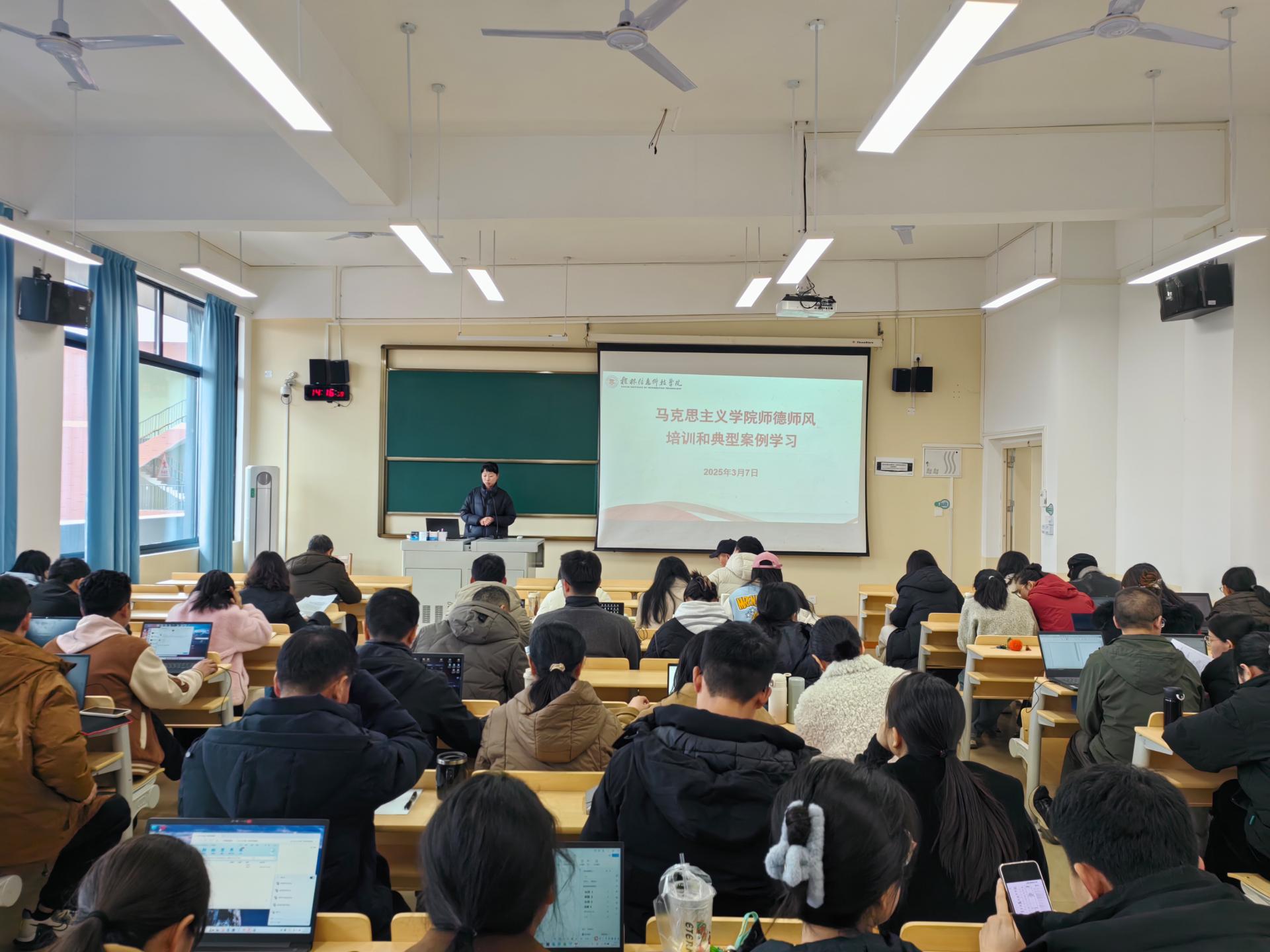 为加强教师队伍建设,马克思主义学院于2025年3月7日在C515教室开展师德师风培训和典型案例学习,此次学习由党总支书记赵奕主持,全体教职工参加。