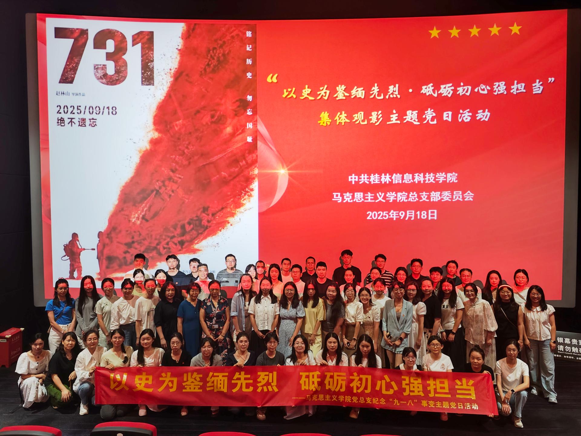 9月18日晚上,马克思主义学院党总支组织全体党员赴临桂万达影城开展“以史为鉴缅先烈砥砺初心强担当”主题党日活动,集体观看历史题材影片《731》。