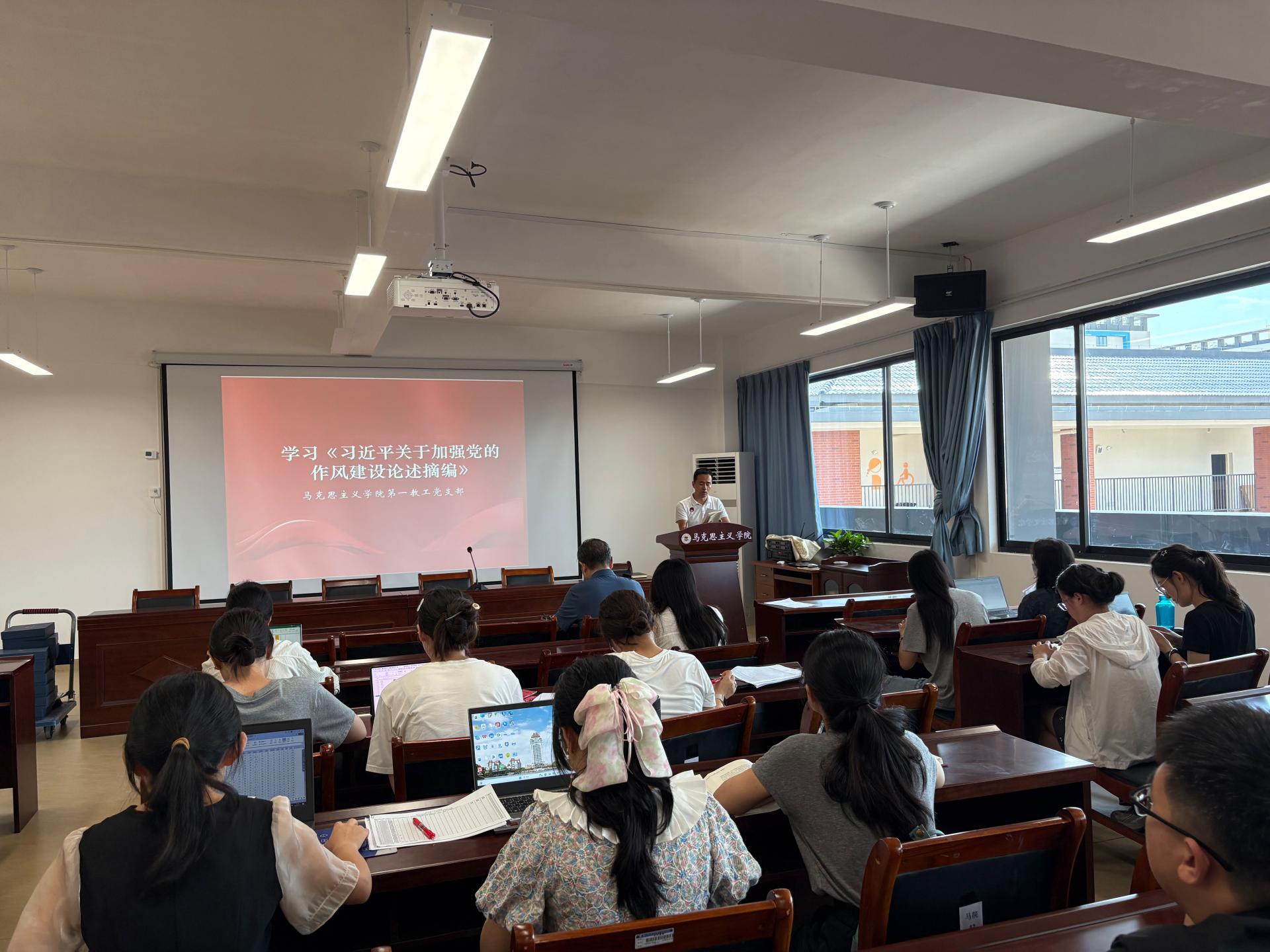 为持续强化理论武装,深入推进全面从严治党,马克思主义学院教职工第一党支部于7月11日在G615开展了党的建设专题理论学习活动。会议由党支部书记吴敏波主持。