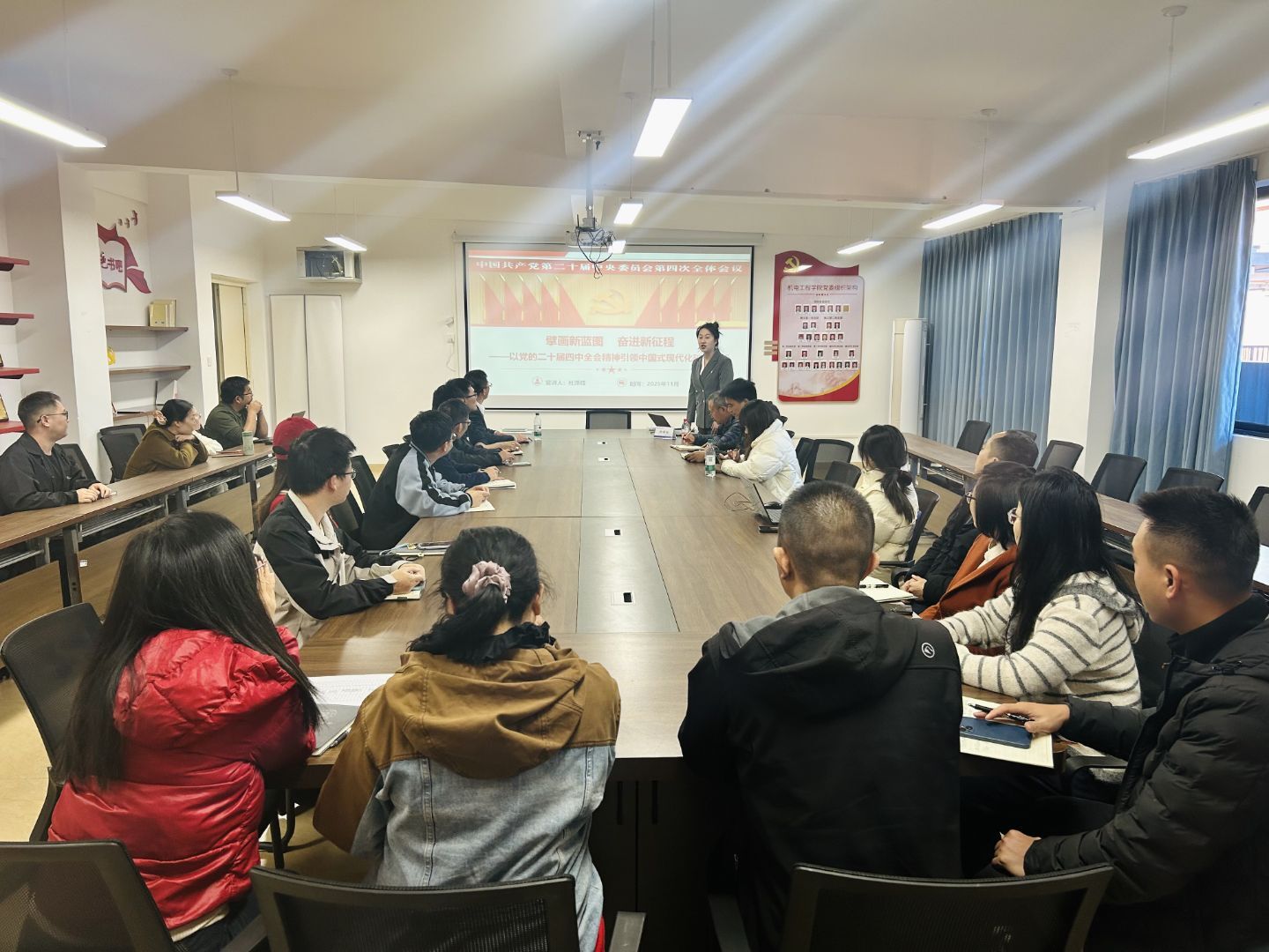 为深入学习宣传贯彻党的二十届四中全会精神,推动党的创新理论深入基层,马克思主义学院第二教工党支部理论宣讲团自11月5日至12月1日,面向学校14个教工和学生党支部开展专题宣讲活动。