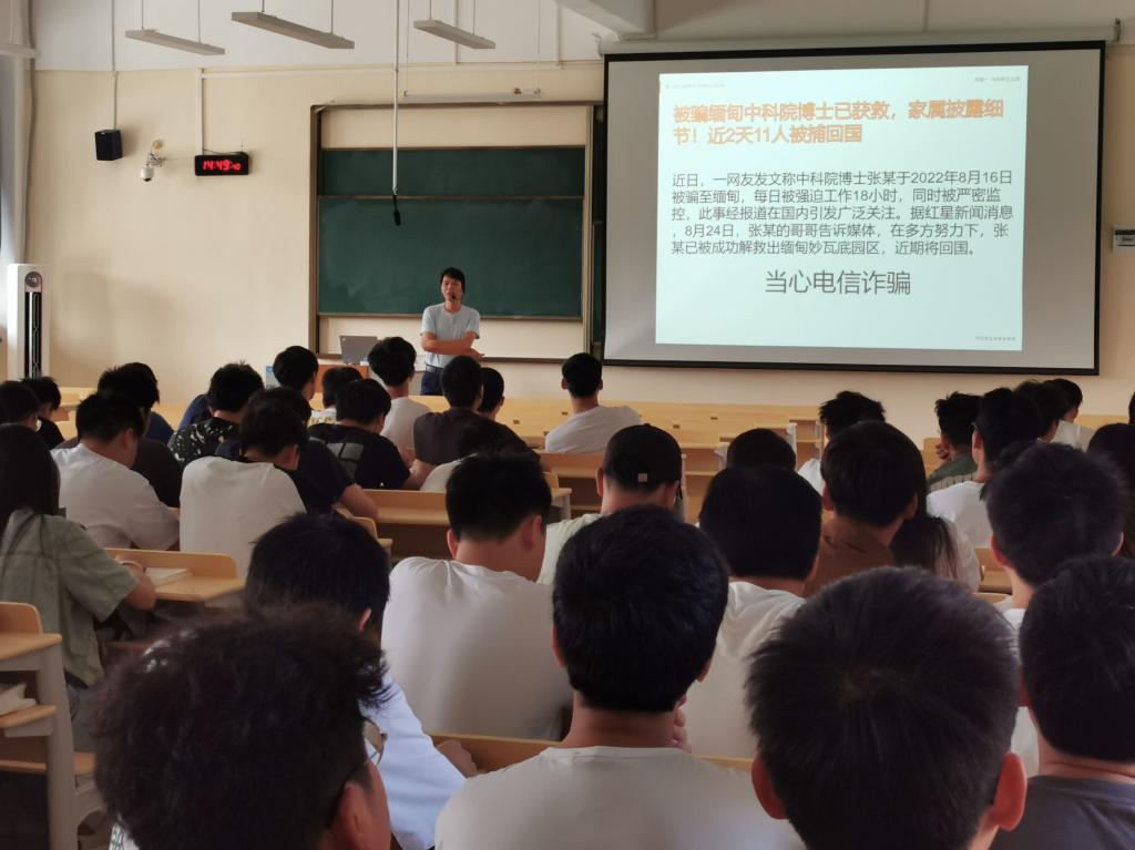 马克思主义基本原理教研室主任王西斌老师从具体案例出发运用马克思主义基本方法教授学生如何透过“电信诈骗”现象识别其本质,进而归纳现在常见的电信诈骗套路,最后引导同学们牢记“六个一律,八个凡是”,遵循“三不一多”原则严防电信诈骗,保护自己身心健康发展。毛泽东思想和中国特色社会主义思想体系概论教研室主任剌啸媛老师也通过现实案例讲解,让同学们看到了诈骗的严重后果,认真上好“防诈”开学第一课。