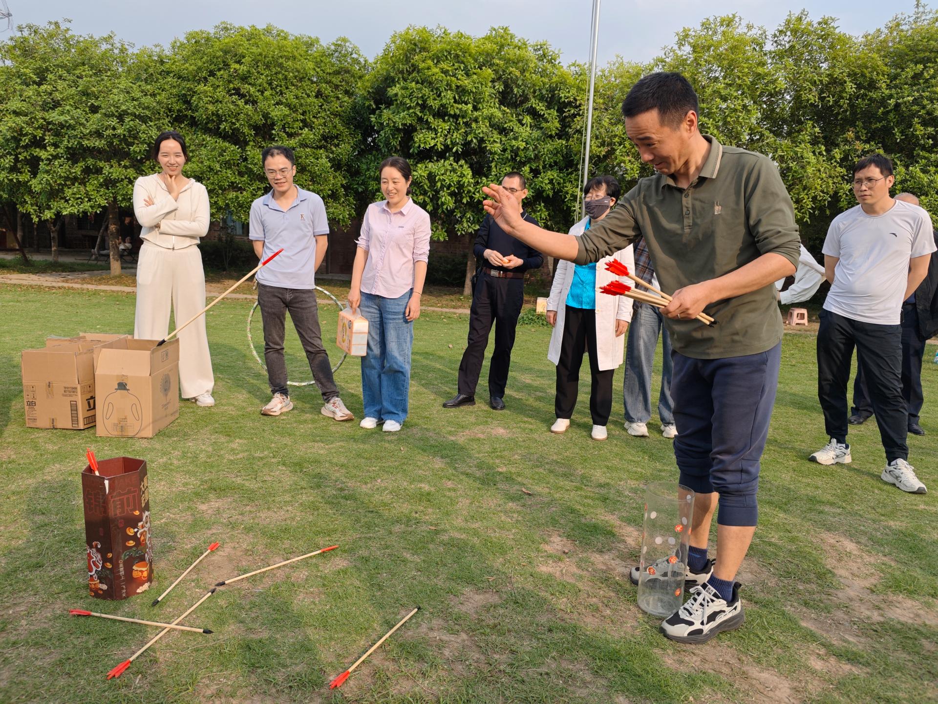 活动设置了“呼啦圈接龙”、投壶等多项趣味性与协作性兼具的项目。在“呼啦圈接龙”中,教师们手拉手传递呼啦圈,默契配合,展现了团队的协调能力;投壶环节则考验专注力与团队策略,大家相互鼓励,现场气氛热烈。通过轻松愉快的互动,教师们不仅放松了身心,更在合作中加深了彼此的理解与信任。
