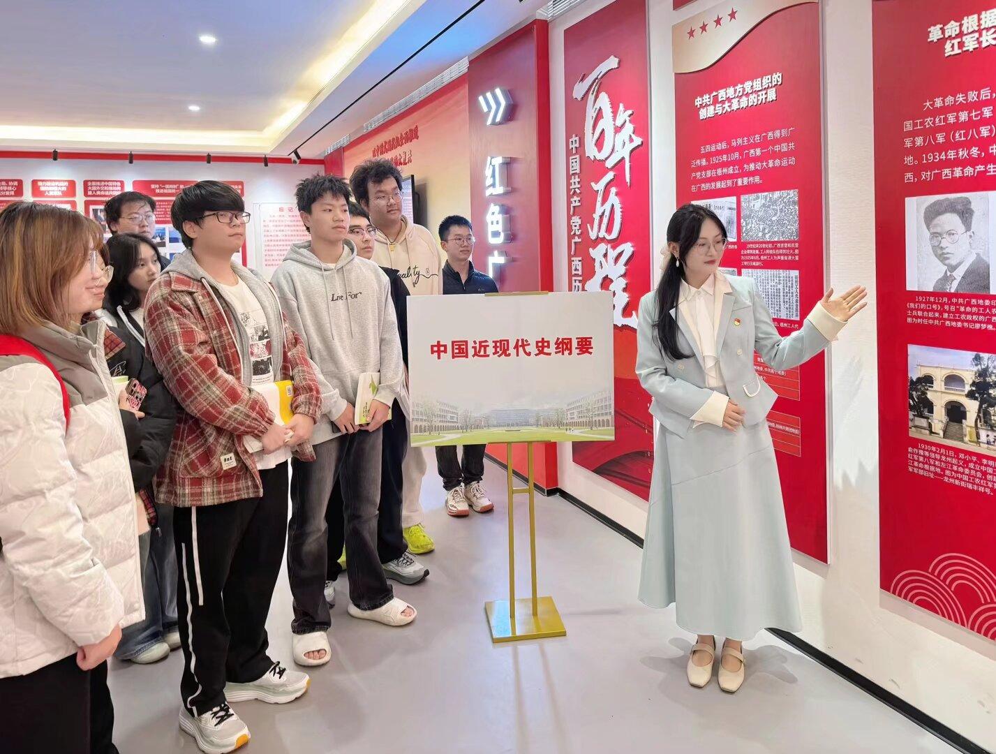 在“百年党史”展区,李星环老师通过珍贵的历史图片和关键时间节点,以生动的叙事方式带领学生回顾了中国共产党从诞生到发展壮大的光辉历程。在“中国共产党人精神谱系”板块,教师们将井冈山精神、长征精神、脱贫攻坚精神等与《中国近现代史纲要》课程中的历史人物事迹相结合,使抽象的精神内涵具象化、立体化。“红色广西”板块充分挖掘本土红色资源的教育价值,周莉老师通过讲述百色起义、湘江战役等重大历史事件,展现了广西各族人民为中国革命作出的重要贡献,让同学们对家乡的革命历史有了更深刻的理解,增强了文化认同感和家国情怀。“科技强国”板块通过展示“嫦娥”探月、“蛟龙”深潜、北斗组网等重大科技成果的影像资料,让同学们直观感受到国家科技实力的飞跃发展,进一步坚定了实现中华民族伟大复兴的信心。在最后的讨论环节,同学们围绕“青年与时代”“理想与担当”等主题展开热烈交流,纷纷表示这种沉浸式的学习方式使教材知识变得鲜活生动,对新时代青年的责任使命有了更深刻的认识。
