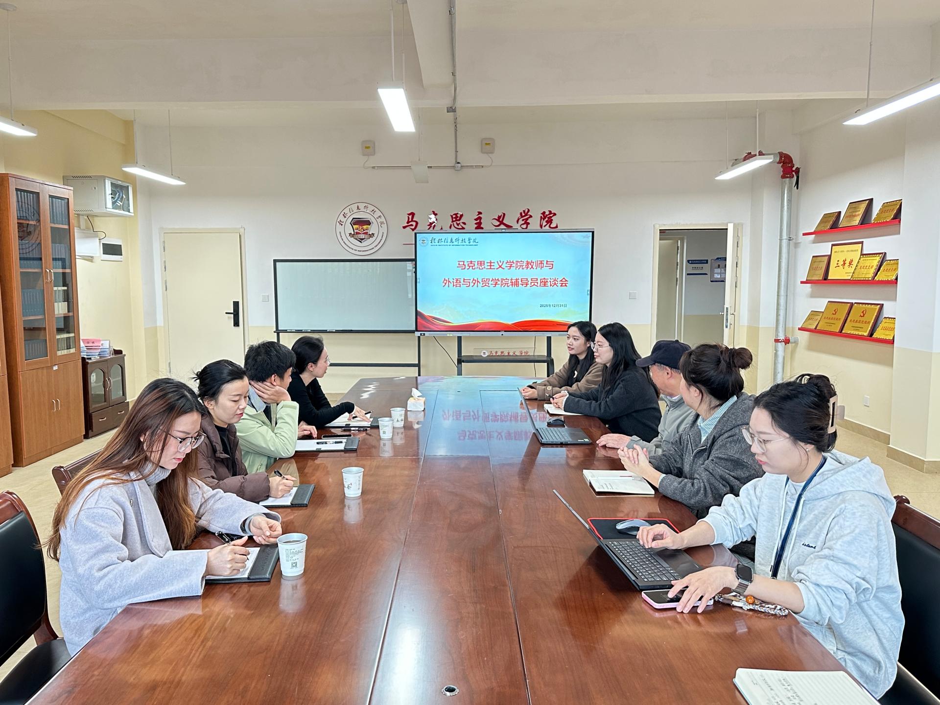 为进一步凝聚育人合力,精准把握学生思想动态与成长需求,马克思主义学院与外语与外贸学院于12月31日在G610开展“学情面对面”联合研讨活动。会议由马克思主义学院院长邱启照主持,两院教师代表围绕学生思想动态、学习诉求及成长困惑展开深入交流,共同探讨思政课优化路径。