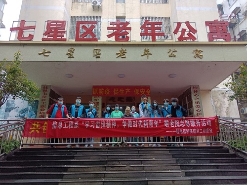 3月27日,信息工程系于桂林市七星区老年公寓开展了“学习雷锋精神,争做时代新青年”雷锋月志愿服务活动。本次活动由我系信息青年志愿者参加。在此次志愿活动中,信息青年志愿者与老人们开展了一系列的温馨活动,陪老人们拉拉家常、讲讲笑话、帮助老人整理内务、打扫卫生、为老人捶捶背。给老人们带去欢乐的同时,更加关心老人们的日常生活,细心地询问老人的生活情况等。本次雷锋月志愿服务活动的成功开展,为敬老院的老人送去...