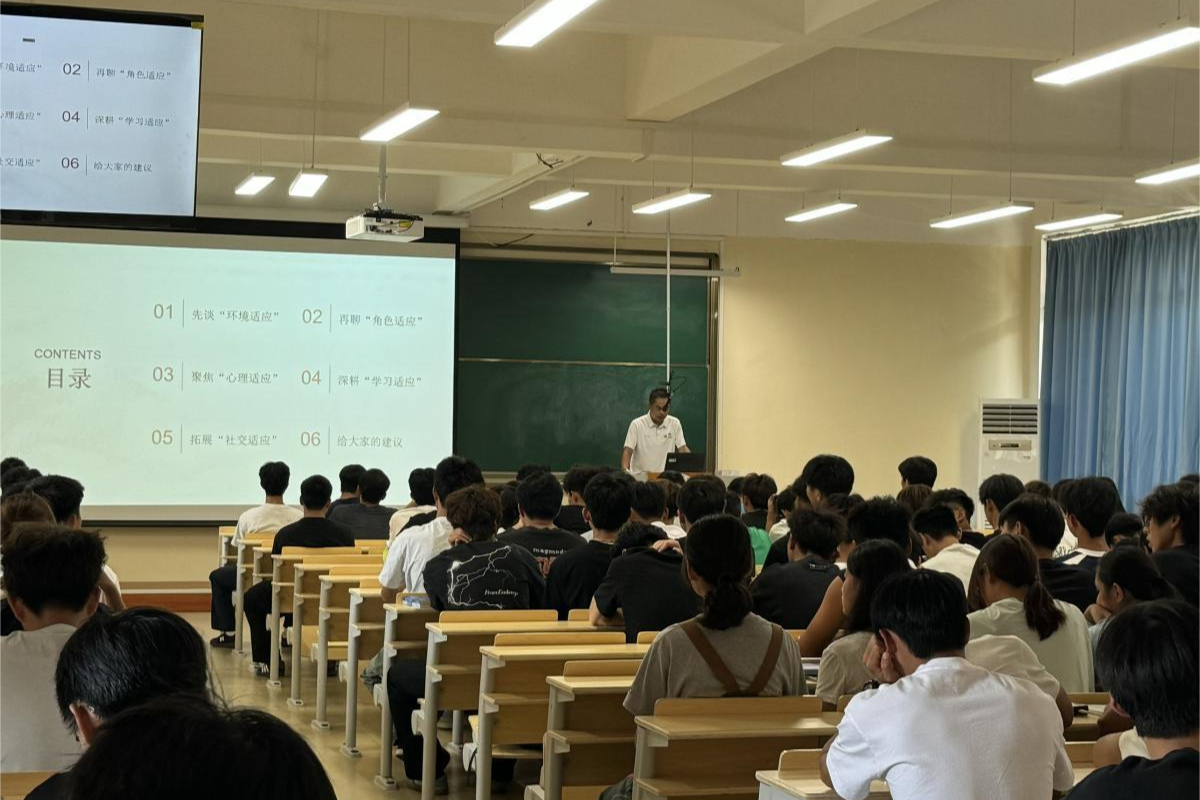 讲座以“开学第一课”为主题,旨在帮助新生尽快完成从中学到大学的过渡。关书记结合新生特点与普遍需求,从环境适应、角色转变、心理调适、学习方法、人际交往等多个维度,进行了全面而深入的适应性教育。他通过生动的案例与互动,引导同学们正视变化、调整心态,并鼓励大家尽早树立明确目标,合理规划宝贵的大学时光。