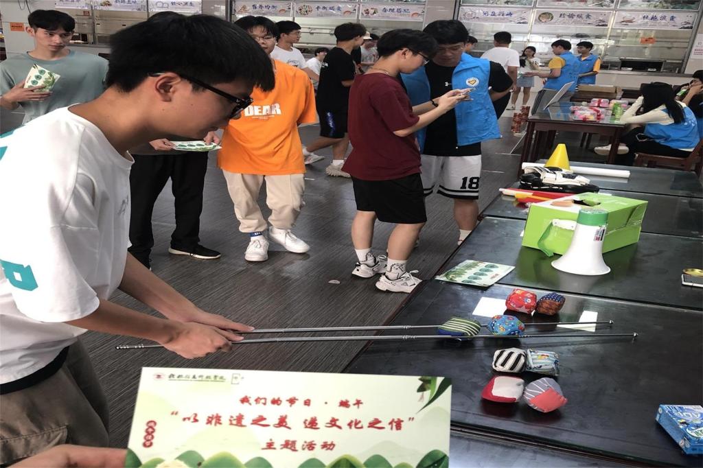 活动现场设有“表演区”、“游戏区”、“体验区”三个区域。“游戏区”内设有端午节传统游戏“投壶”,只要投壶投进者,即可获得“端”、“午”、“安”、“康”印章之一,凭借印章数量可在兑换区内兑换精美礼品;“表演区”设有民族传统表演;现场还设有“体验区”可以自己动手制作龙舟模型、折扇、五彩绳、香囊等,并由食堂阿姨现场教学如何包粽子。
