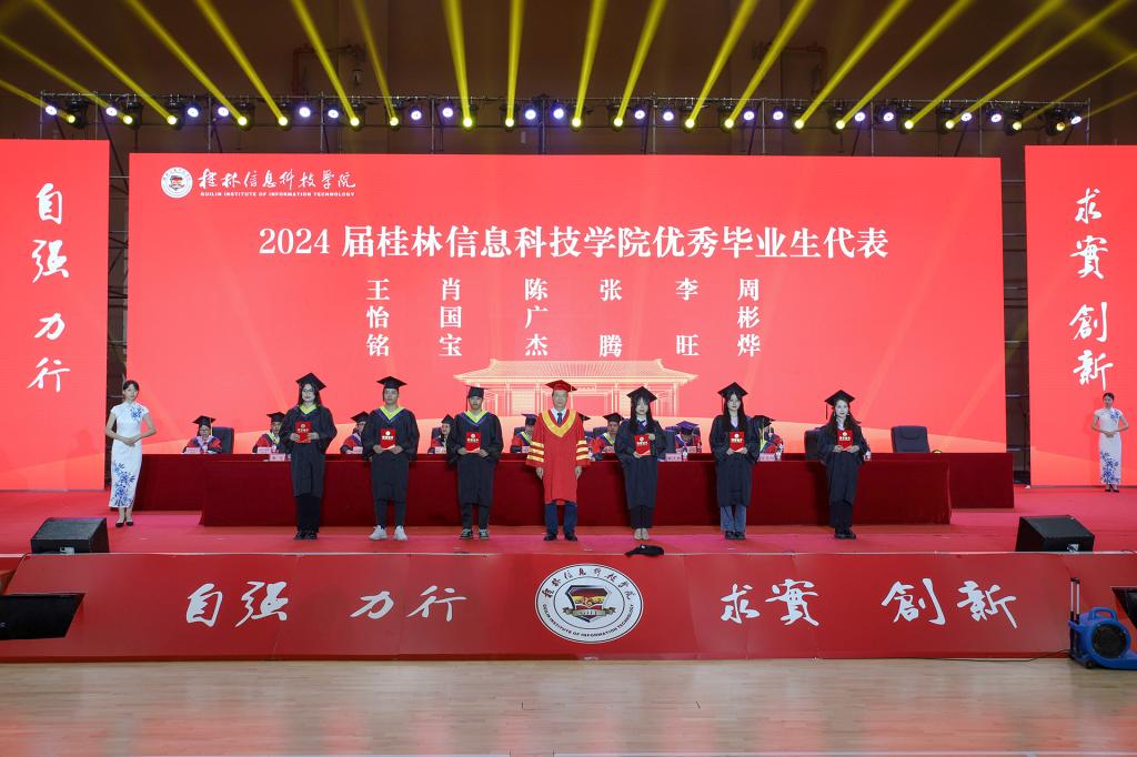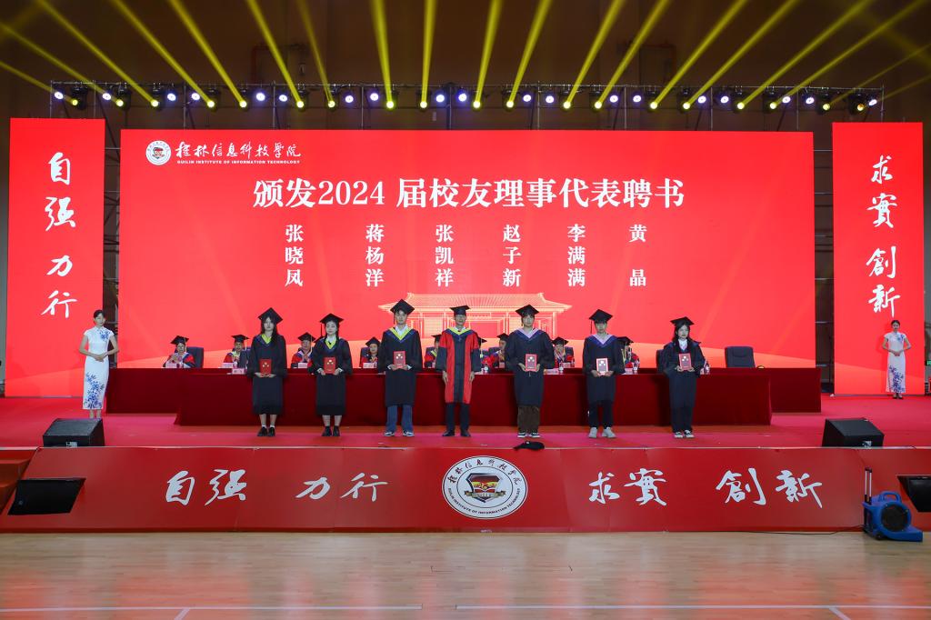 晚上19时,典礼在庄严的国歌声中拉开序幕。副校长刘跃峰宣读2024届广西区优秀毕业生、学校优秀毕业生及毕业生干部表彰决定。董事长罗欣、校长解庆林、副校长刘跃峰分别为2024届广西区优秀毕业生、学校优秀毕业生、学校优秀毕业生干部颁发了荣誉证书。党委副书记、纪委书记李飞宣读了关于聘任beat365中文官方网站2024届校友理事代表的决定,副校长刘跃峰颁发2024届校友理事聘书。