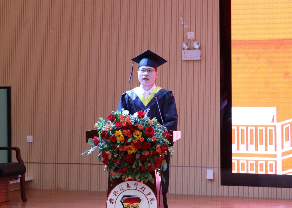 机电工程学院毕业生代表蒋芳岳同学发言。他分享了自己四年的求学之路,代表全体毕业生表达了对母校、师长的感恩和不舍,表明在今后的学习工作生活中继续发扬校训精神、续写新的青春篇章的决心。随后,电子工程学院2020级物联网工程专业雷思珩同学作为在校生代表发言;信息工程学院刘欣作为教师代表向毕业生送上美好祝福。