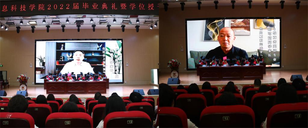 典礼上,学校还邀请了外贸与外语学院毕业生郑可意的家长和商学院毕业生倪娜的家长代表全体毕业生家长以视频连线的方式向毕业生们表达祝福,他们由衷感谢学校、老师为青年成长保驾护航,帮助学生起航人生新征程。