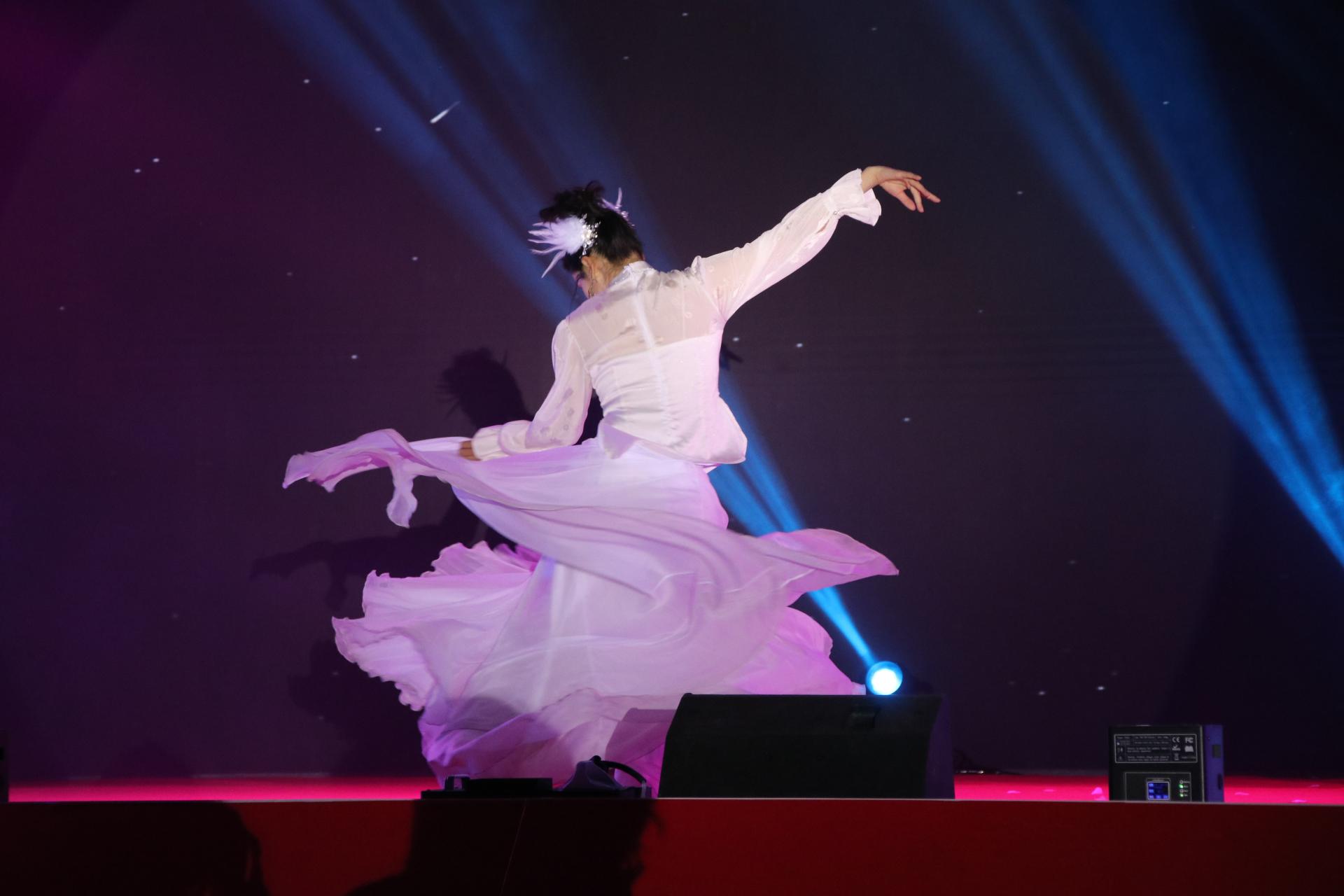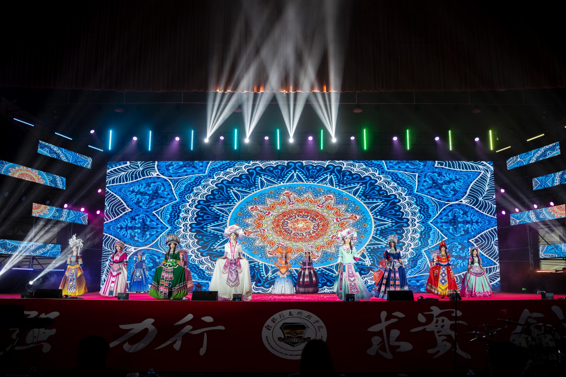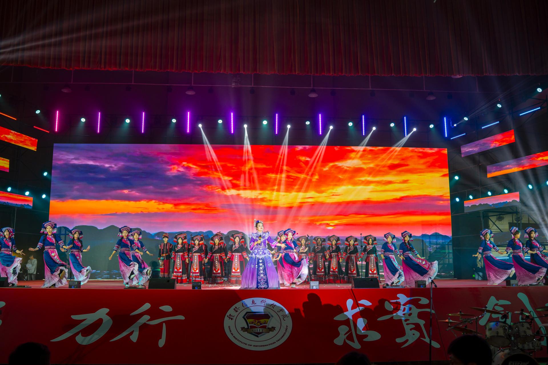晚会精心编排为两大篇章,第一篇章“风华共韵”宛如一幅绚丽多彩的画卷,聚焦山水之美与非遗底蕴,将壮乡风情娓娓道来。校园十佳歌手联袂献唱《老友记》,熟悉的旋律瞬间点燃全场热情;活力舞蹈《青春有你》紧随其后,舞者灵动身姿让气氛持续升温。民族乐舞《青山绿野》似清风拂面,带观众领略自然文化韵味,仿若置身青山绿水间。非遗文化秀《锦绣霓裳》匠心独运,模特身着精美传统服饰,步伐优雅,尽显中华传统美学典雅厚重,让观众近距离感受非遗魅力。民族歌舞《大地飞歌》饱含民族风情,歌手嘹亮歌声唱出对土地的热爱,舞者优美舞姿展现民族文化的生机。蒙古族独舞《敕勒川》惊艳全场,舞者豪迈奔放,赢得阵阵掌声。