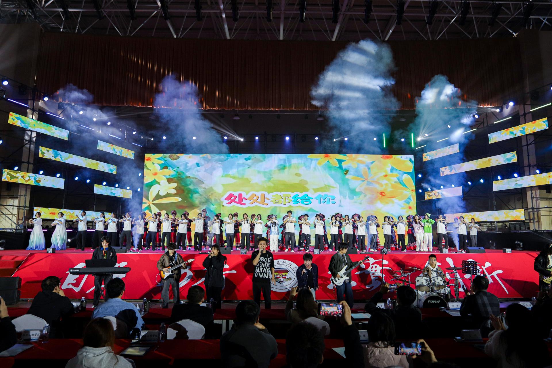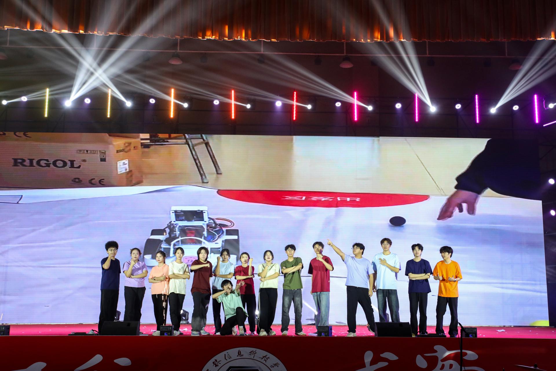 校园十佳歌手以一曲《篇章》开启第二篇章“筑梦芳华”,本篇章聚焦青年担当与逐梦初心,传递拼搏精神。原创舞台剧《梦想启航》以电赛为背景,生动展现信科学子拼搏坚持,他们面对困难不退缩的精神打动了现场的观众。原创光影群舞《追光者》借助光影营造梦幻氛围,舞者如夜空繁星,向幕后筑梦人致敬,引发共鸣。合唱《明天会更好》温暖坚定,传递对未来的期许,让人感受希望的力量。击青乐队演奏的《鲜花》将气氛推向高潮,激昂的旋律、动感的节奏让全场沉浸欢乐,为晚会画上圆满句号。