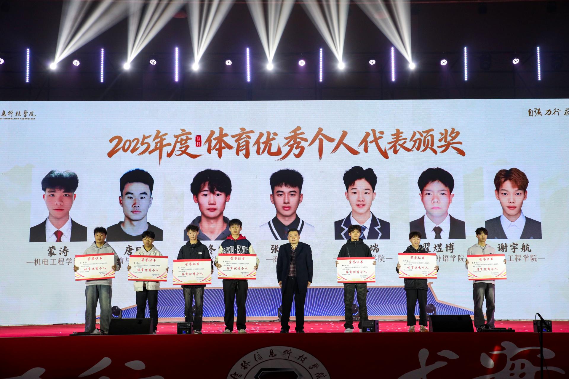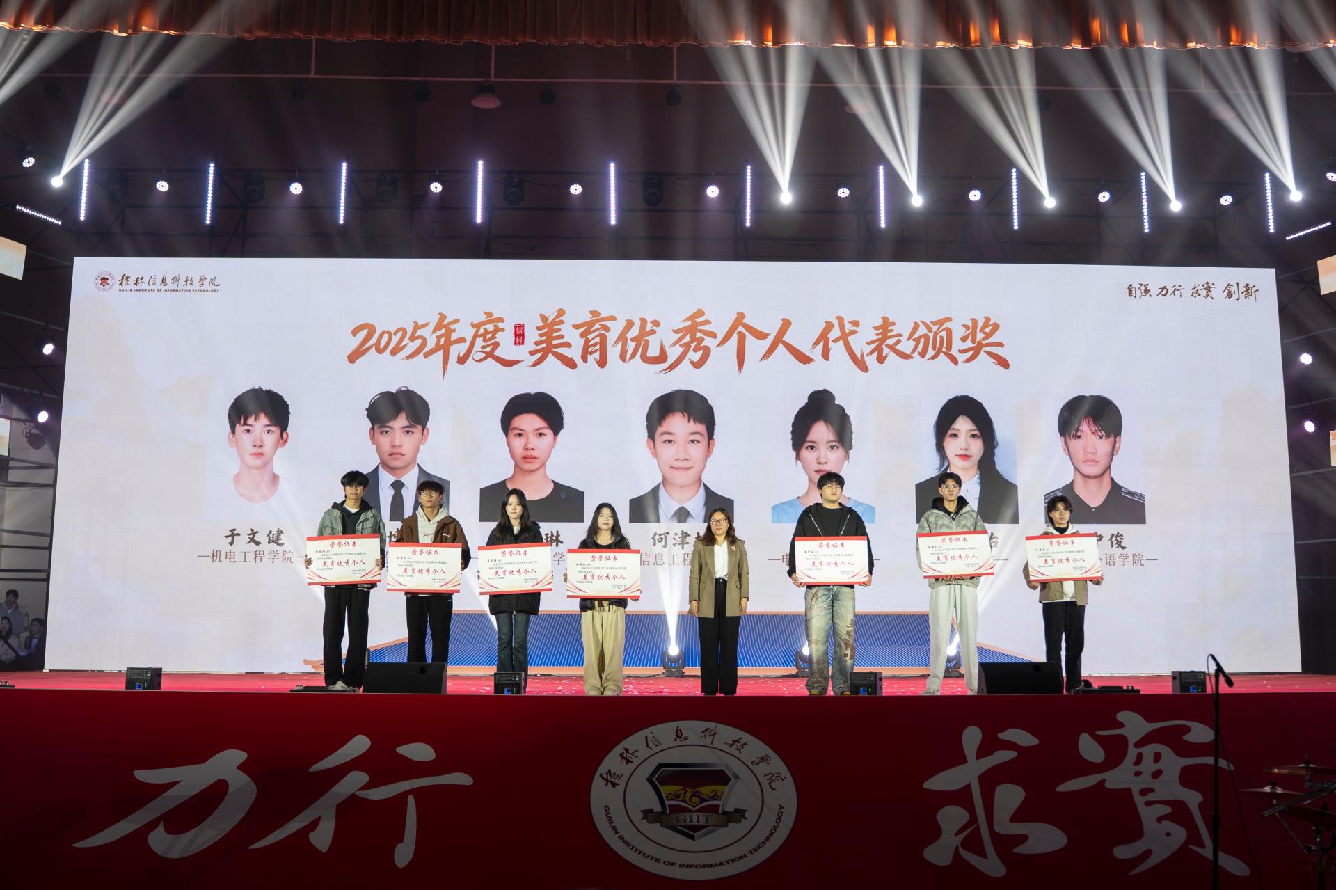 晚会期间,学校举行2025年度美育、体育领域“优秀个人代表”表彰仪式。这些优秀个人在各自领域表现突出,用行动诠释美育与体育精神内涵。学校借此弘扬精神、树立标杆,激励更多学生参与美育和体育活动,为未来发展凝聚动力。