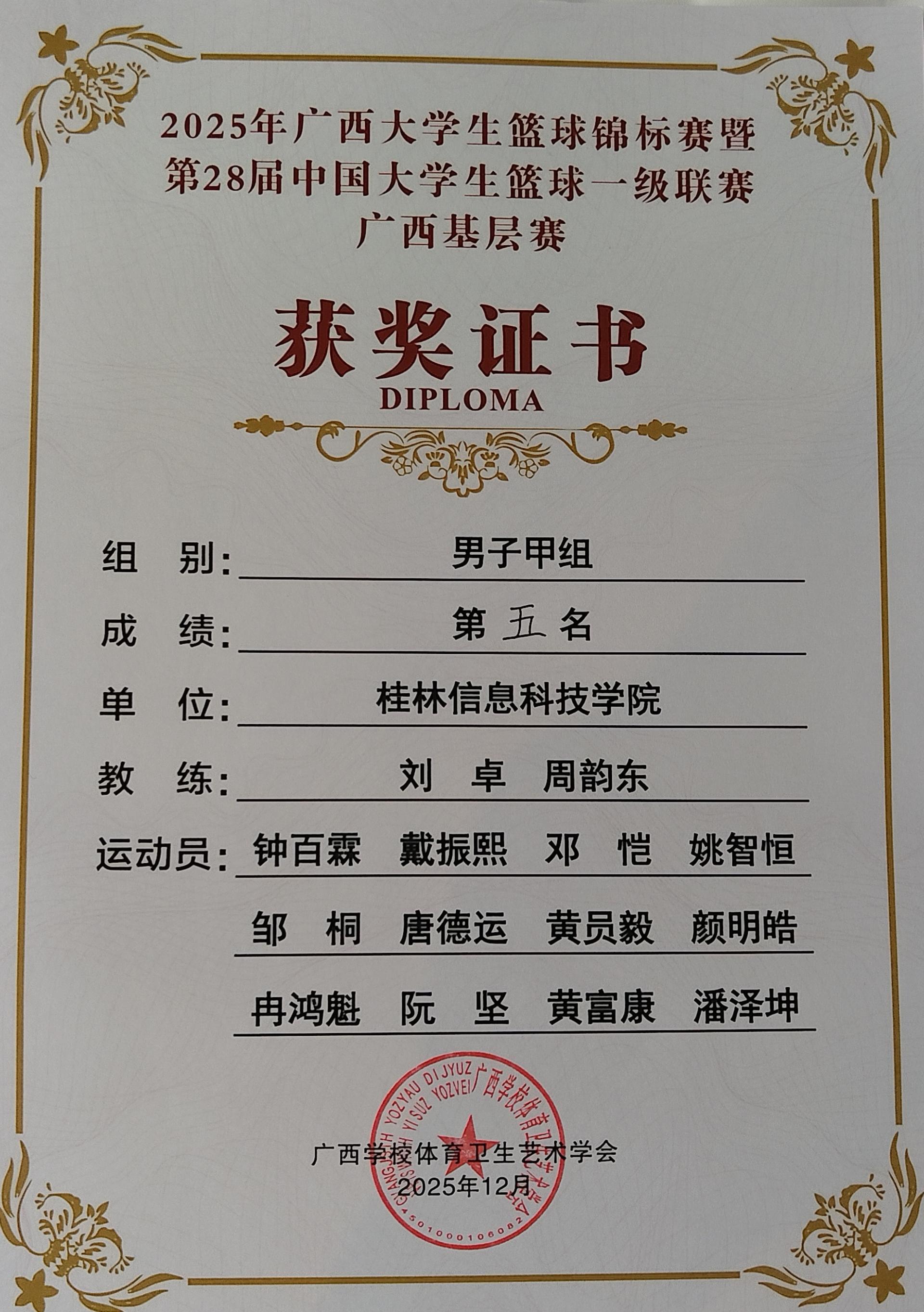 12月23日至28日,由广西学校体育卫生艺术学会、广西民族大学承办的第28届中国大学生篮球一级联赛(CUBAL)广西基层赛圆满落幕。beat365官网体育与健康学院刘卓、周韵东两位老师带队,钟百霖等12名同学参赛,斩获赛事佳绩。