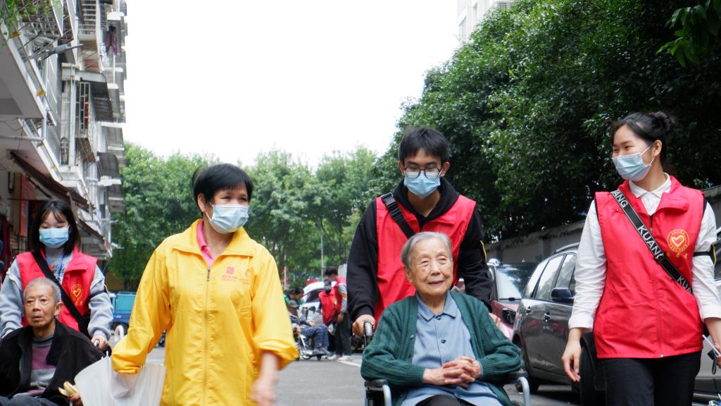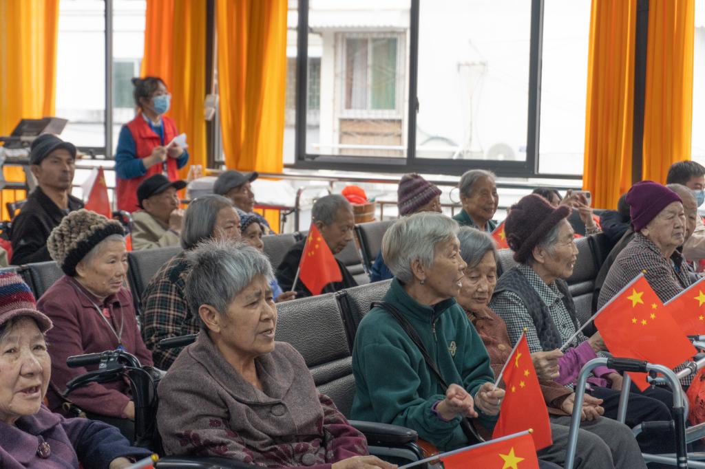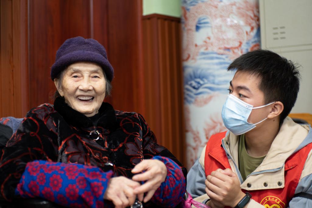 队员们带着慰问品抵达养老院,为老人们送上自己的一份心意。随后在活动大厅为老人们献唱《没有共产党就没有新中国》、《歌唱祖国》、《东方红》等经典红歌,老人们在观演的同时与志愿者们齐声共唱,现场氛围温馨和谐。在陶然居养老院叶静颐院长的示范解说下,志愿者们了解到如何规范使用轮椅、助步器等器械,在护工陪同下随老人外出散步。交流过程中,志愿者们从老人身体状况、生活饮食、日常活动等方面了解老人在养老院的生活点滴。老人对志愿者们的到来和关怀表示赞扬。