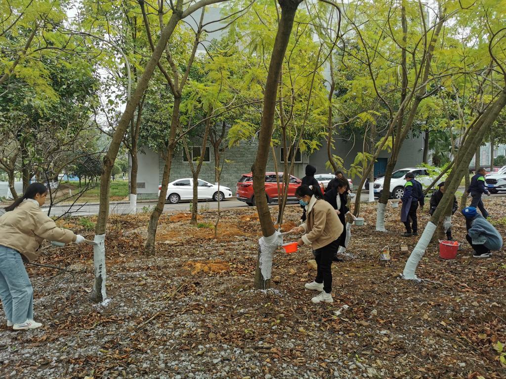 此次志愿服务活动在信科无业直属党支部的老师的指导下,设计系的党员同志们有序地分为两批,一批在寒风中将篮球场周围和三教二区后面的全部涂上了防虫保暖的白漆,另一批将三教一区二区中间道路的树木全部除草松土完毕,大家在规定的时间内高质量的完成了志愿服务工作。