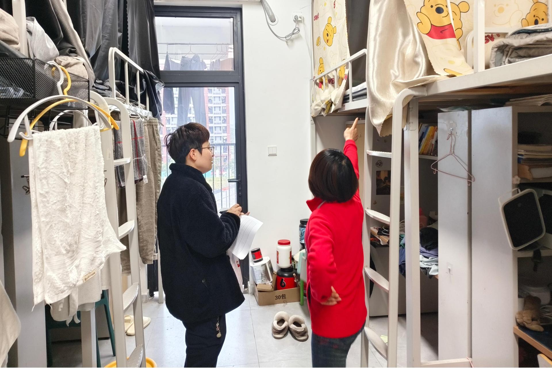 为确保排查无死角、无盲区,辅导员们深入学生宿舍一线进行检查。检查过程中,辅导员与社区房管员逐一排查宿舍内的电路安全,仔细查看卫生状况,记录发现的插排串联、杂物堆积等潜在风险,并向学生说明问题危害,明确限期整改时间。