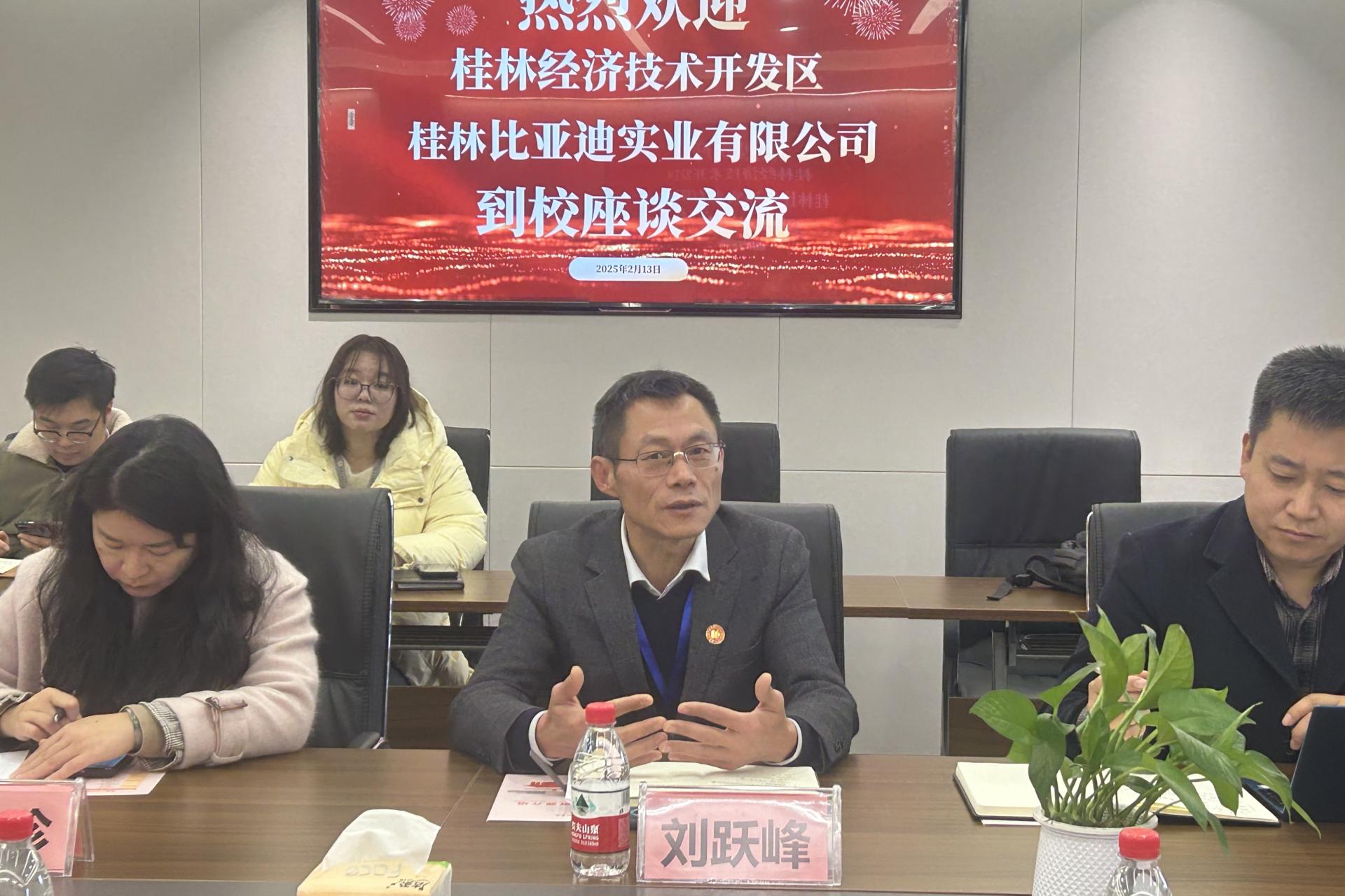 2月13日上午,桂林经济技术开发区管理管委会副主任李荣光、桂林比亚迪实业有限公司总经理徐光辉一行来beat365官网洽谈合作。学校副校长刘跃峰,就业指导服务中心、校企合作处、机电工程学院、电子工程学院、商学院相关负责人在知行楼830会议室与来访客人进行了座谈交流,会议由就业指导服务中心主任兼校企合作处处长李晓健主持。