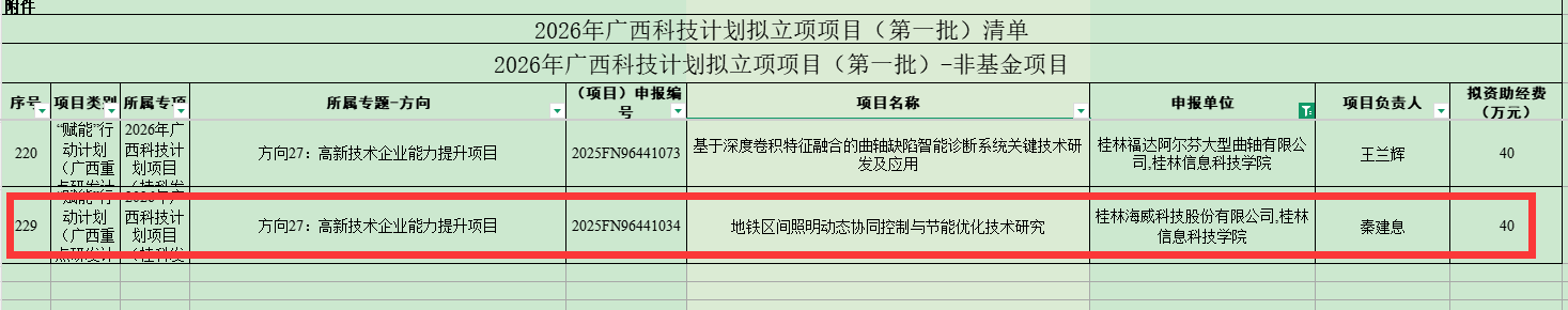近日,广西科技厅公布2026年第一批广西科技计划拟立项项目清单(桂科发〔2025〕288号),beat365中文官方网站电子工程学院与桂林海威科技股份有限公司联合申报的“地铁区间照明动态协同控制与节能优化技术研究”项目成功入选“赋能”行动计划,项目拟获资助经费40万元,项目编号为2025FN96441034。该项目隶属于广西重点研发计划“方向27:高新技术企业能力提升项目”,项目聚焦当前地铁照明系统发展需求,旨在通过技术研发推动行业优化升级。未来将由学院负责核心算法研发和理论支撑,企业负责工程化应用和市场推广,实现产学研精准对接。