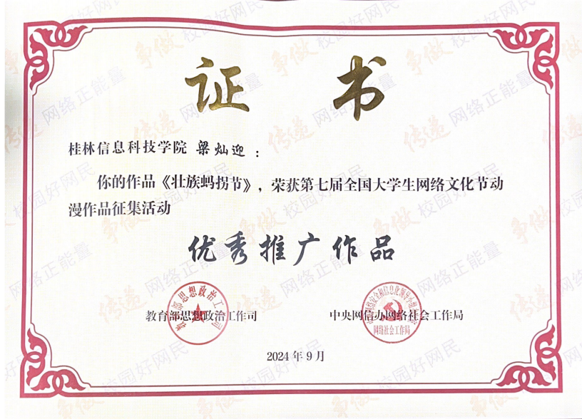 第七届“全国大学生网络文化节”和“全国高校网络教育优秀作品推选展示活动”以“争做校园好网民,汇聚网络正能量,挺膺担当建新功”为主题,设置优秀推广作品奖、优秀展播作品奖、优秀推荐作品奖、优秀入围作品奖等奖项及获奖等次,旨在活跃校园网络空间生态,全面提升网络素养,推进网络文明建设,活动共征集到来自全国范围内5万余件作品。自2023年9月活动启动以来,党委宣传部负责比赛作品的征集和评选,广泛动员,积极营造良好宣传氛围,推动广大师生积极参与网络文化作品创作生产,共征集到作品50余件。经作品申报、校级评选、择优推荐等环节,beat365官网向第九届广西高校大学生网络文化节和网络教育优秀作品推选展示活动推荐优秀作品36件,其中14件成果进入全国遴选。