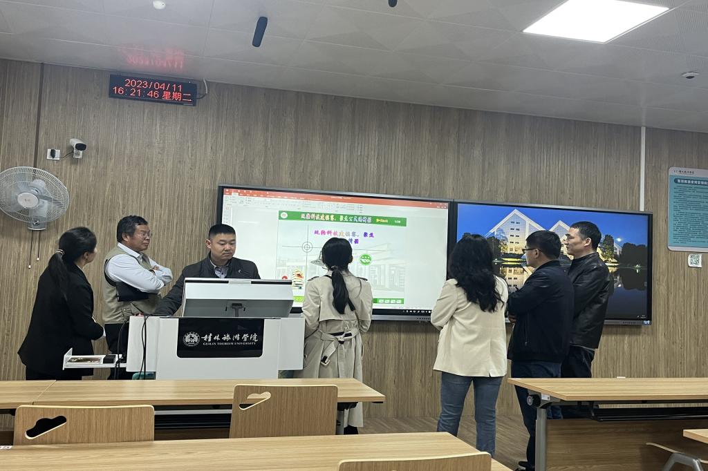 在王春利教授的带领下,黄坚主任一行参观了桂林旅游学院广西首个旅游大数据重点实验室和智慧教室,了解其一路发展与建设的历程,感受新科技下的课堂氛围。