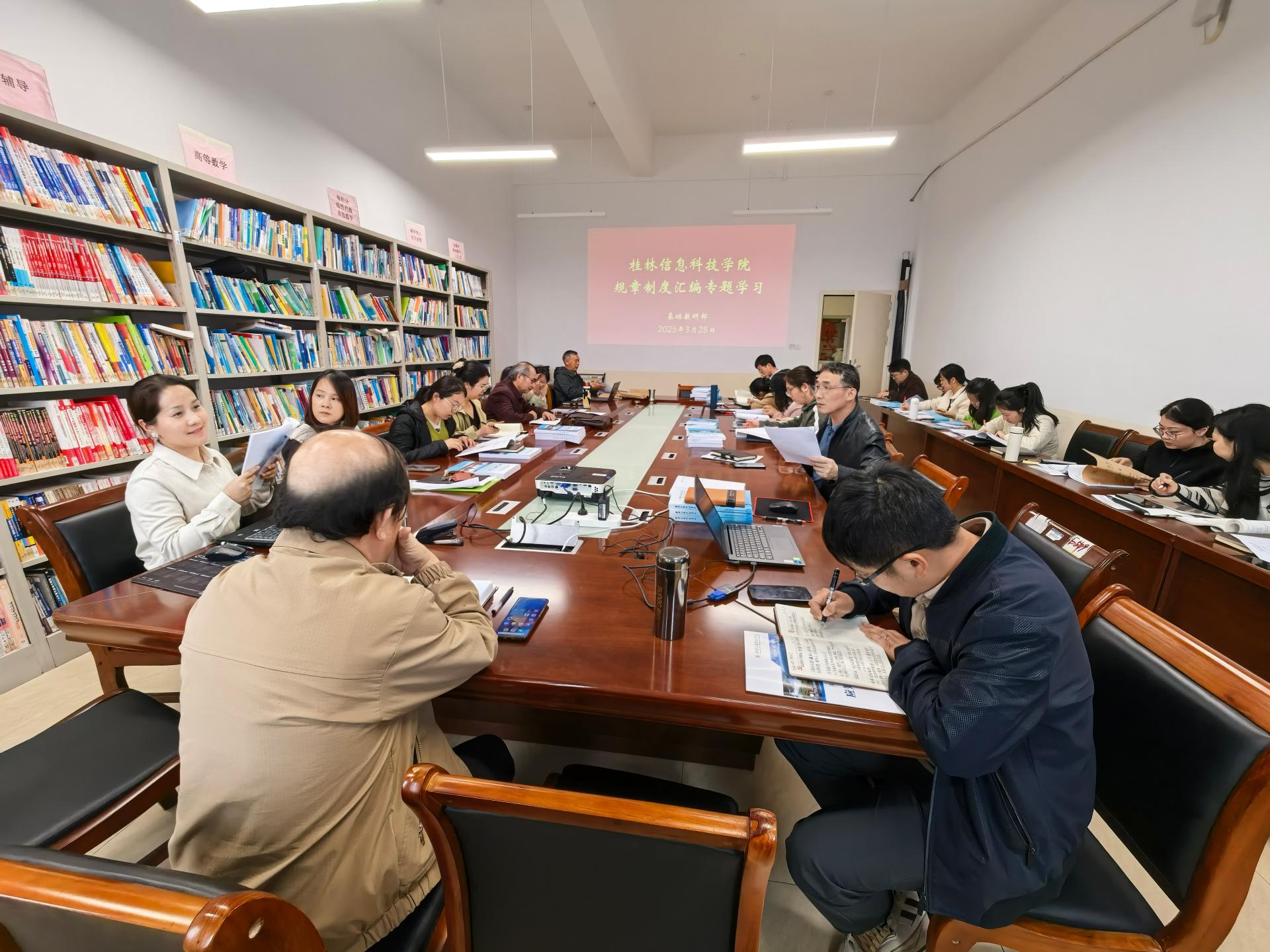 为全面贯彻教育教学质量提升要求,扎实推进本科教学工作合格评估准备工作,3月28日,基础教研部组织全体教职工在博文楼F525会议室开展专题学习会。基础教研部主任助理汪敏庆、办公室主任张爱分别围绕“本科教学工作合格评估应知应会”与“规章制度汇编”两项核心内容展开领学,基础教研部全体教职工以饱满的热情参与学习研讨。