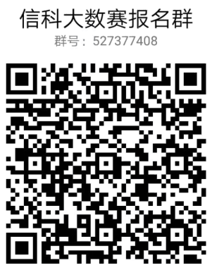 4.报名要求:各参赛院校于2024年9月15日前组织学生扫描下方二维码完成预报名,并于9月20日前完成缴费,签名确认正式报名。为了方便后续竞赛工作正常开展,请报名同学加入“信科大数赛报名群”,如需了解其他细节亦可在群内交流,群号527377408,群二维码如下: