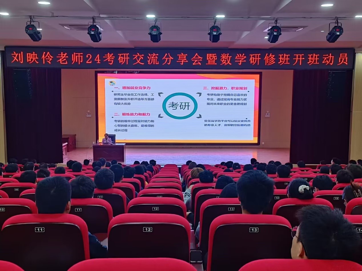考研——是学子们追求的一个梦想,也是一个艰苦漫长的过程。为提升师生满意度,充分发挥党建引领作用。10月31日,数学教研部直属党支部举办了一场面向全校学生的考研分享会,讲座由数学党支部书记刘映伶主持,以“正确定位,专注于心”为主题,通过每年报考人数和历届考研招录比让同学们认清当前考研形势,了解考研的意义及就业前景,通过举例和分析历届录取分数线鼓励大家确定目标,就如何择校选专业、如何准备研究生各阶段考试、如何安排学习时间提出很多很好的建议,告知学生以积极乐观的心态迎接考研这一巨大挑战,同时分析了数学在考研中占据重要地位,并向学生表示,数学教研部的所有老师都是大家的良师益友,随时为大家答疑解惑。