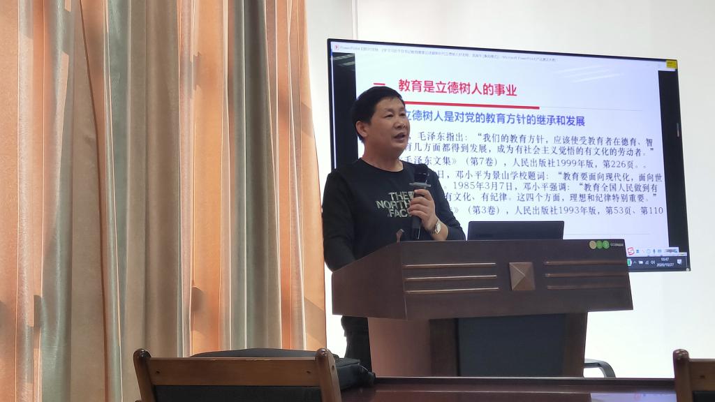 龙海平教授主要从以下四个内容进行阐述:1.教育是立德树人的事业;2.立德树人要以德为本;3.立德树人应以树人为核心;4.立德树人,重在落实。龙海平教授强调,社会之德、学校之德、教师之德是学生立德的前提,并结合多年的教学经验,向我们阐述了作为教育工作者应该树立好教师之德,以教师之德育学生之德。同时还强调要树立健康第一的教育理念,抓好思政建设和教师队伍建设,把思政教育与实际教学相结合。