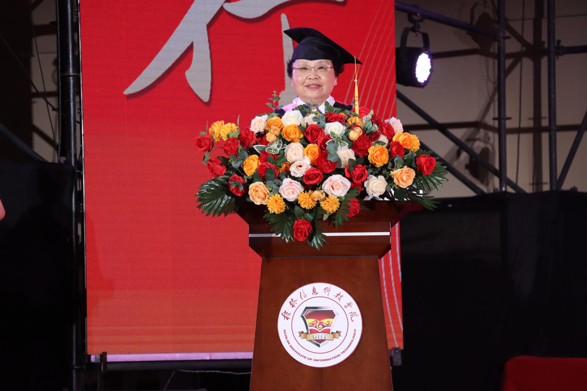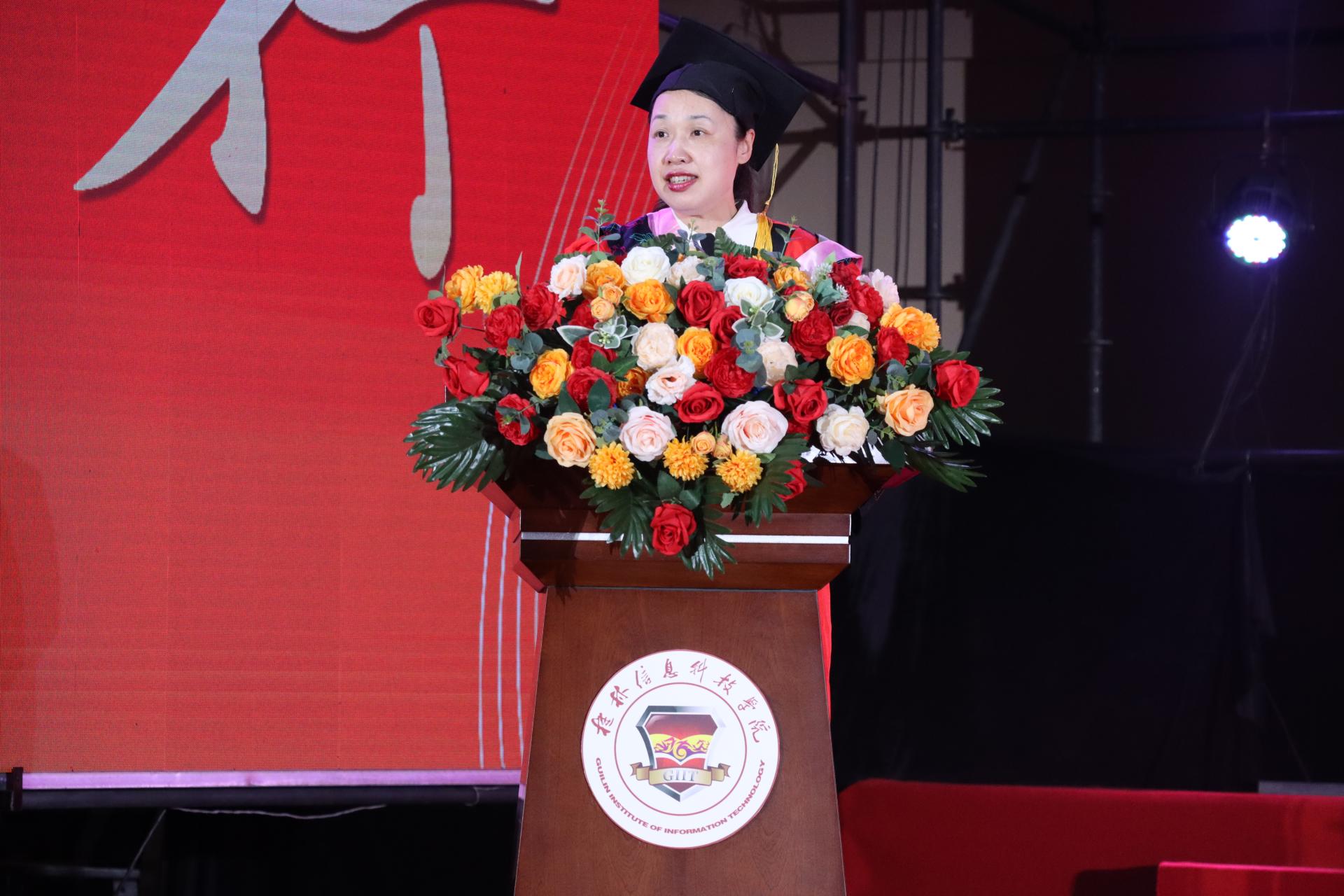 典礼在雄壮的国歌声中拉开序幕。罗捷副校长代表学校向全体毕业生致以最热烈的祝贺。他在致辞中深情回顾了同学们在校期间与国家发展、学校奋进同向同行的珍贵岁月,特别是在科技变革与产业升级浪潮中展现的商科学子担当。院长周洁教授随后发表饱含深情的毕业寄语。她表示,商学院永远是毕业生的坚强“后盾”,无论同学们将来走得多远、飞得多高,商学院永远是大家的精神家园。