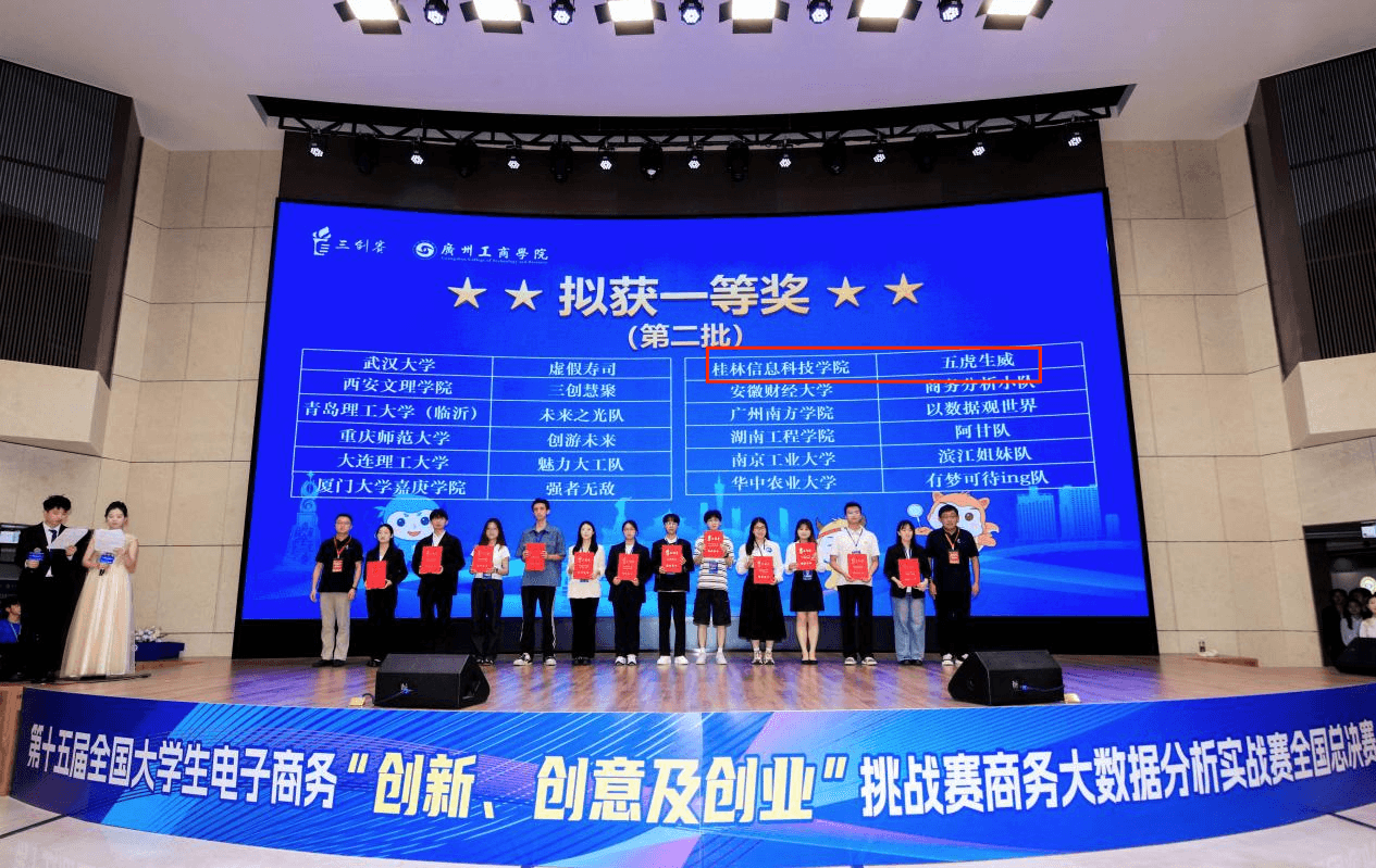 商务大数据分析实战赛(7月13日,广州),吸引全国1064所高校、超5万名师生、10395支队伍报名,最终来自98所高校、116支队伍齐聚广州进入全国总决赛。beat365官网“五虎生威”团队以广西赛区第三名的成绩晋级国赛,并勇夺全国一等奖。该团队的两位指导老师同样获评“全国总决赛优秀指导老师”。