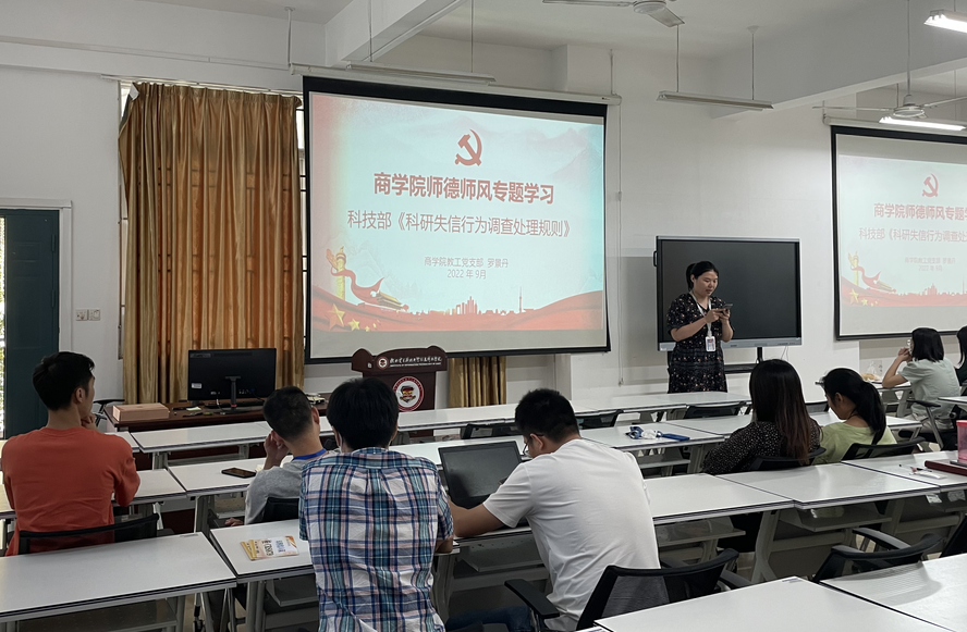 为加强学校师德师风建设,进一步规范科研行为,9月20日,商学院教工党支部在11210开展师德师风专题学习。本活动由党支部支委罗景丹同志领学,全体党员教工参与了本次学习。