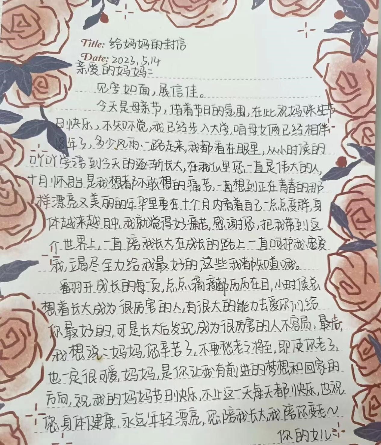通过此次活动,同学们能够更加勇敢表达对母亲的感恩与爱,在充满爱意的五月末尾,“浓情五月,感恩母爱”活动圆满结束。