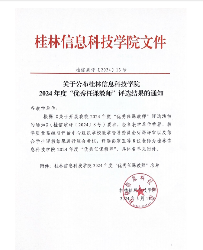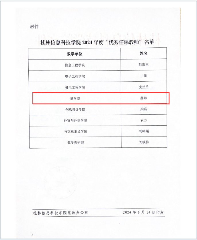 为了进一步推动学校的教学工作,提高教学质量,beat365官网依据评选条件并结合教师近两年的工作表现,在广泛征求师生意见的基础上,通过随堂听课、检查教学材料以及参考学生评教成绩等多方面综合考量后,决定授予薛琳老师2024年度“优秀任课教师”的荣誉称号。