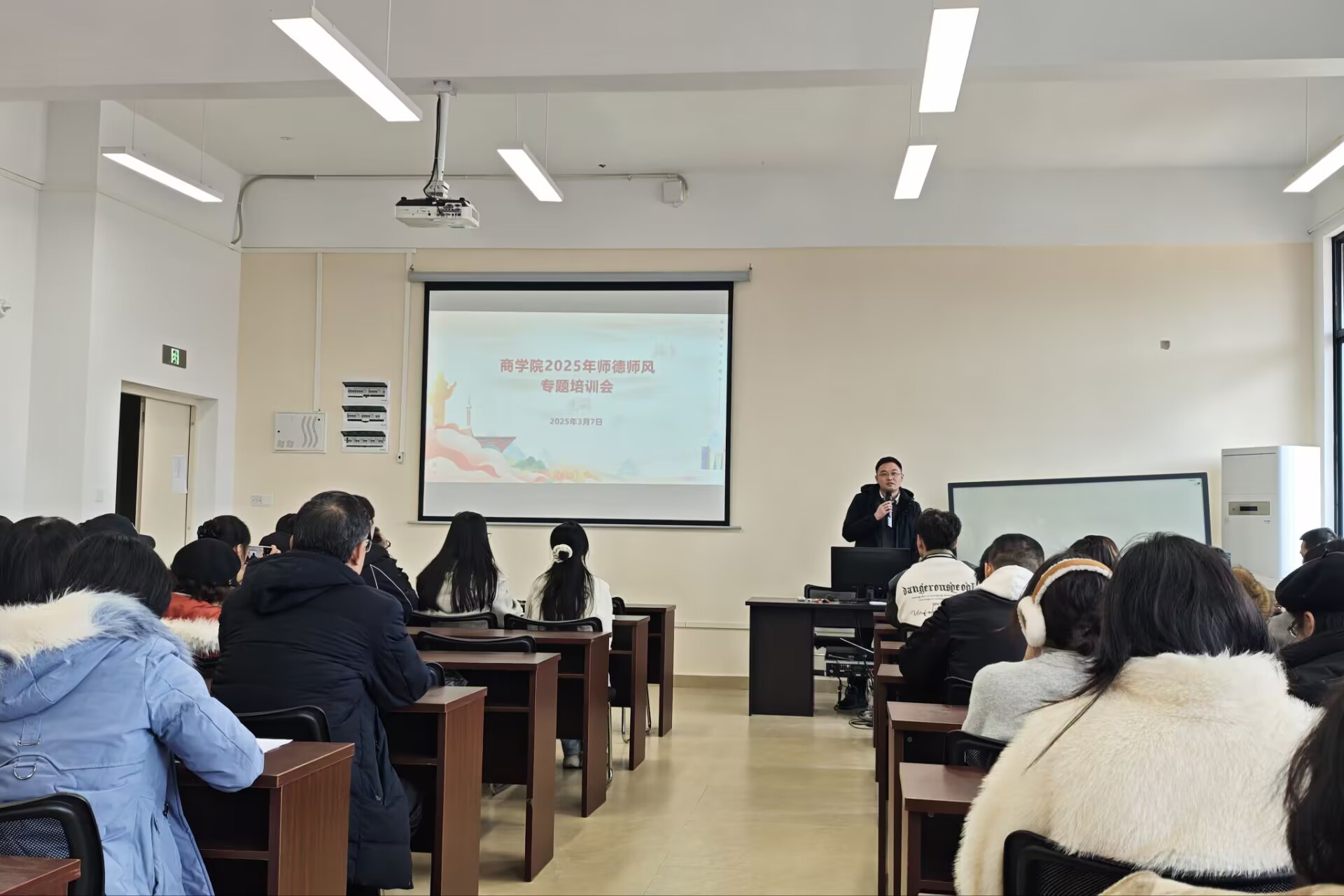 为落实立德树人根本任务,加强学院师德师风建设,弘扬新时代教师道德风尚,提升广大教师自我修养、潜心教书育人的责任意识,3月7日下午,商学院在F311召开2025年师德师风专题培训会,会议由学院党委书记许奇主持,全院教职工参会。