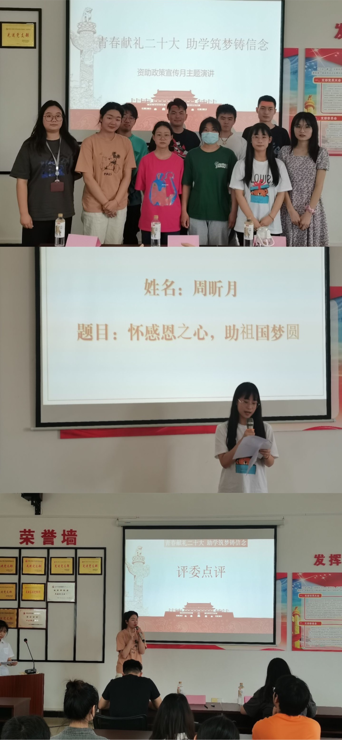 为通过学生资助政策成长事迹、实际行动和心路历程等,引领身边同辈关注党的二十大、了解党的二十大,自觉将“小我”成长融入“大我”奋斗,将人生选择与中华民族伟大复兴中国梦结合起来。5月6日,商学院于11501党史活动室举办“青春献礼二十大 助学筑梦铸信念”资助主题演讲比赛初赛选拔活动,商学院资助老师张缘及各年级辅导员出席并担任本次活动评委。