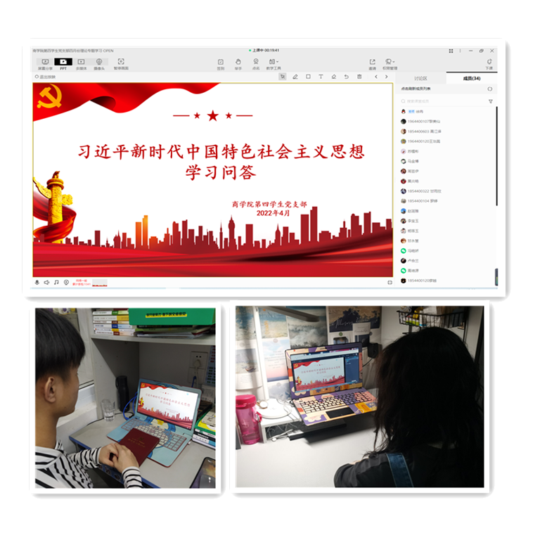 4月11日,由商学院党总支主办,第四学生党支部承办的《习近平新时代中国特色社会主义思想学习问答》专题学习线上开展。本次学习由商学院第四学生党支部书记徐冉老师主持,全体师生党员参加。