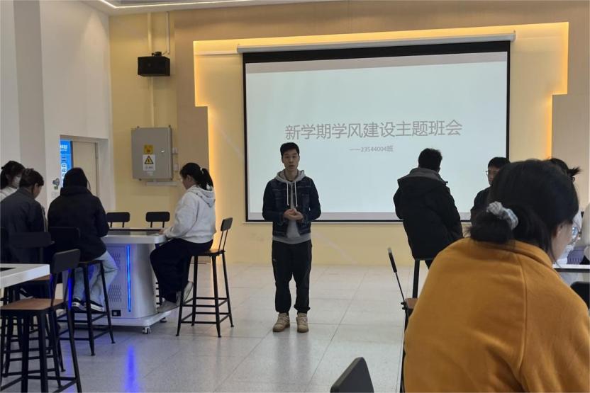 班会伊始,陈龙围绕“学风建设”核心主题,结合班级实际情况与新学期培养要求,从课堂纪律、作业完成、备考规划、实践创新等方面展开讲解,鼓励同学们以严谨务实的态度对待学业,主动规划学习路径,在专业学习中锤炼本领、提升素养。在互动交流环节,同学们围坐在智慧桌前,结合自身学习困惑与目标踊跃发言。陈龙耐心倾听、细致解答,针对大家关注的课程难点、实践方向、升学就业等问题逐一分析,并分享高效学习方法与时间管理技巧。