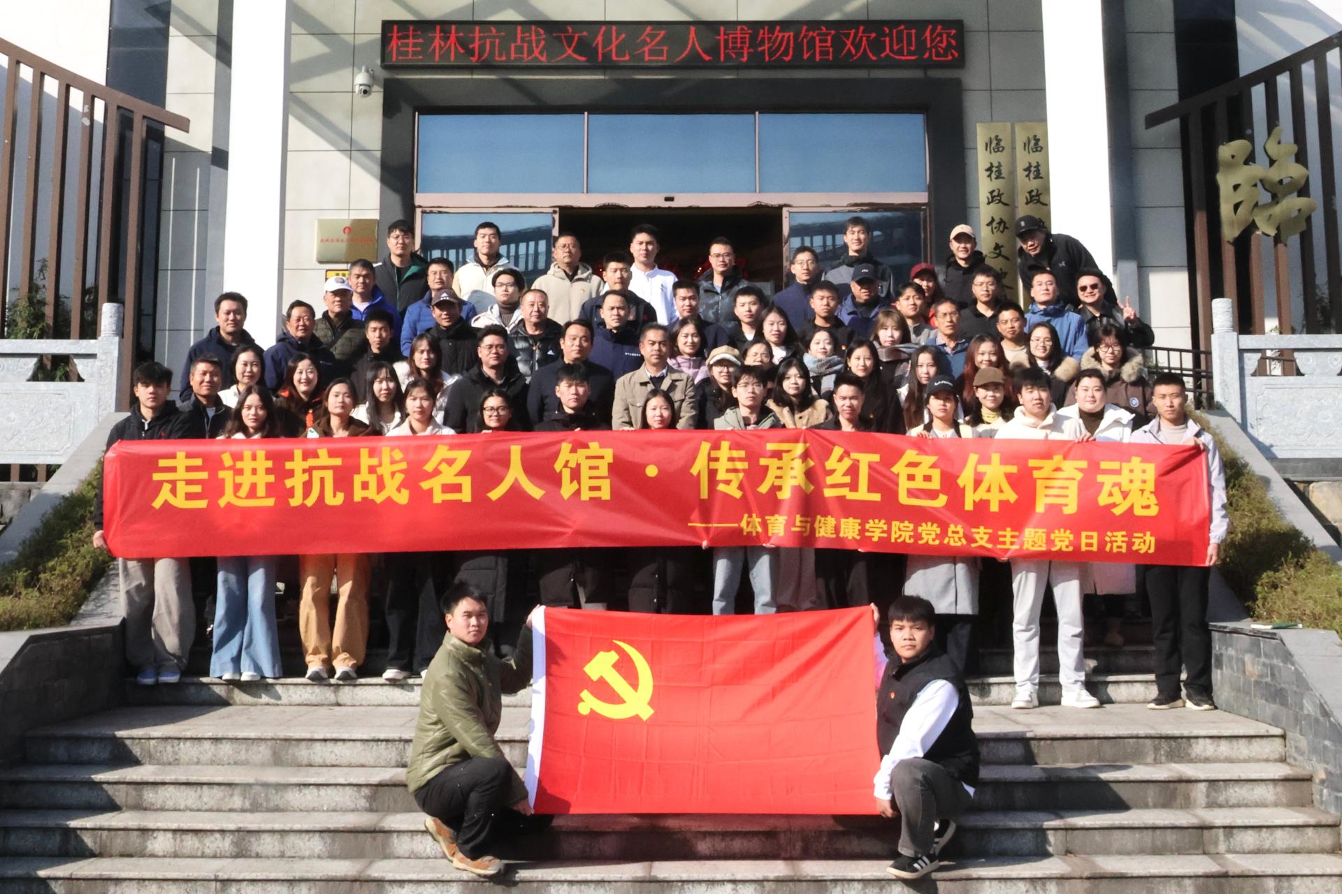 为弘扬革命精神、厚植爱国情怀,推动党史学习教育与体育专业特色深度融合,12月14日,体育与健康学院党总支组织师生党员代表50余人赴桂林抗战文化名人博物馆,开展“走进抗战名人馆·传承红色体育魂”主题党日活动,通过实地研学、情景互动、实践研讨等形式,重温抗战时期体育人的家国担当,汲取奋进新时代的精神力量。