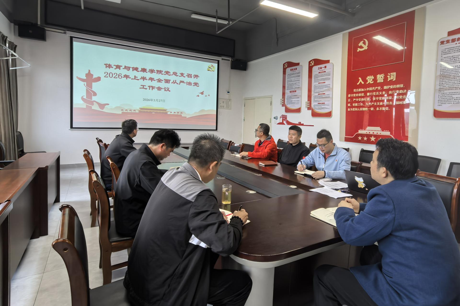 3月27日,体育与健康学院党总支在205会议室召开2026年上半年全面从严治党工作会议,学院党总支书记关永康主持会议,全体党总支委员参会。