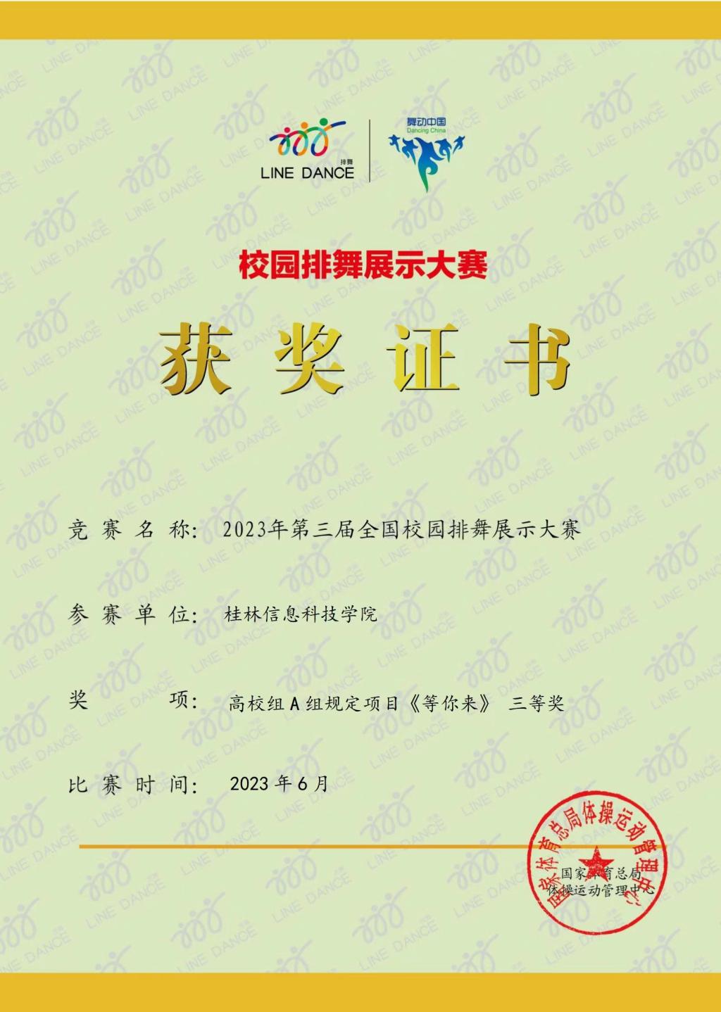 近日,由国家体育总局体操运动管理中心主办的2023年第三届全国校园排舞网络展示大赛圆满收官,本次赛事采用网络录制视频参赛,beat365官网体育与健康学院彭松英、郑亮老师指导的作品《等你来》荣获高校规定组三等奖。