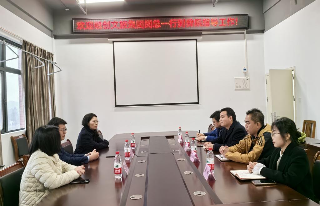 周院长首先对闵总一行的到来表示热烈欢迎,在交流会上,闵总详细介绍了融创文旅集团(桂林)的企业文化、业务范围和人才需求。院长表达了学院对校企合作的高度重视和期望他表示,学院一直致力于培养学生的实践能力和职业素养,希望通过校企合作联合培养,为学生提供更多实践机会,增强学生的就业竞争力。随后,双方就校企合作的具体事宜进行了深入沟通。经过充分的讨论和交流,双方合作内容、形式和时间等方面达成了共识。