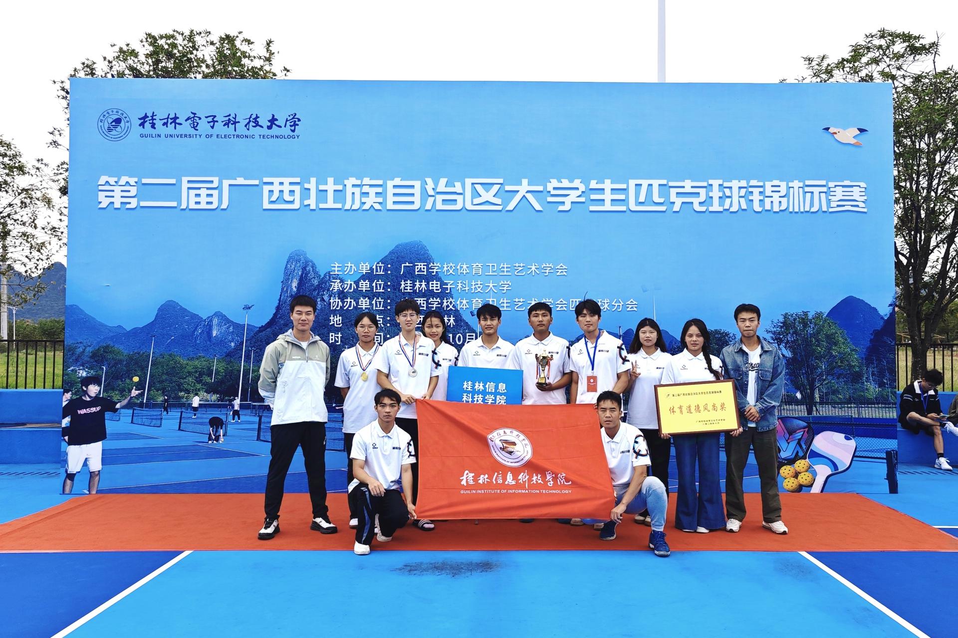10月18日至20日,由广西学校体育卫生艺术学会主办,桂林电子科技大学承办的第二届广西壮族自治区大学生匹克球锦标赛在该校花江校区圆满收官。beat365官网体育与健康学院温鹏、卢锦钊两位老师率队参加此次锦标赛并获得2金1银的好成绩。