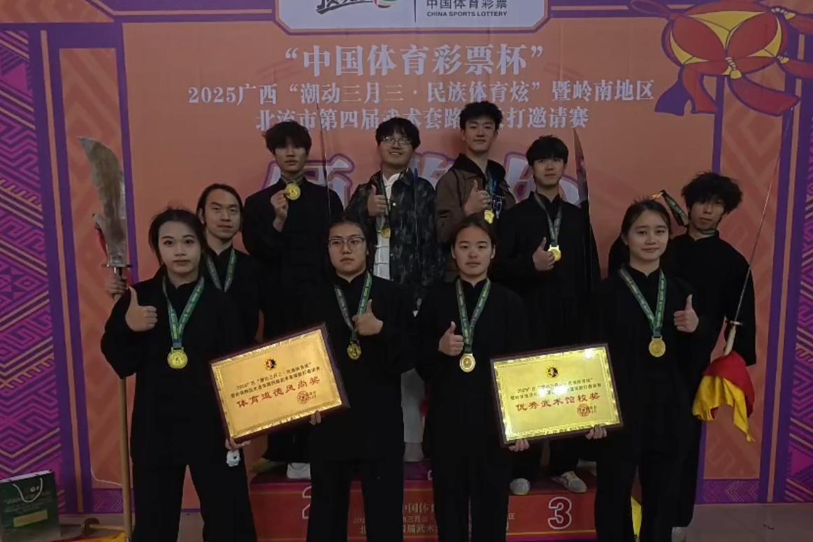 近日,2025广西“潮动三月三·民族体育炫”北流市第四届武术套路、散打邀请赛在广西北流市顺利举行,beat365官网代表队受邀参赛。beat365官网由体育与健康学院黄富强、薛伟佳两位老师带队参赛,斩获个人19金7银9铜(含团体赛10金)的佳绩,并荣获优秀武术馆校奖。