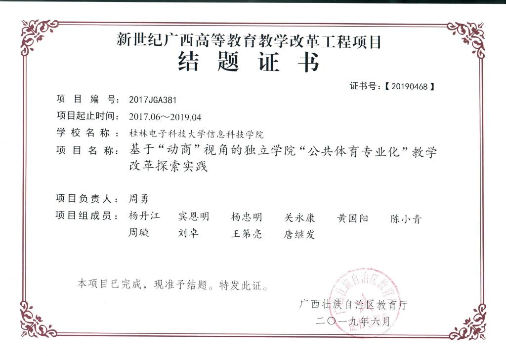 省部级教改项目结题证书-基于动商视角的独立学院“公共体育专业化”教学改革探索实践